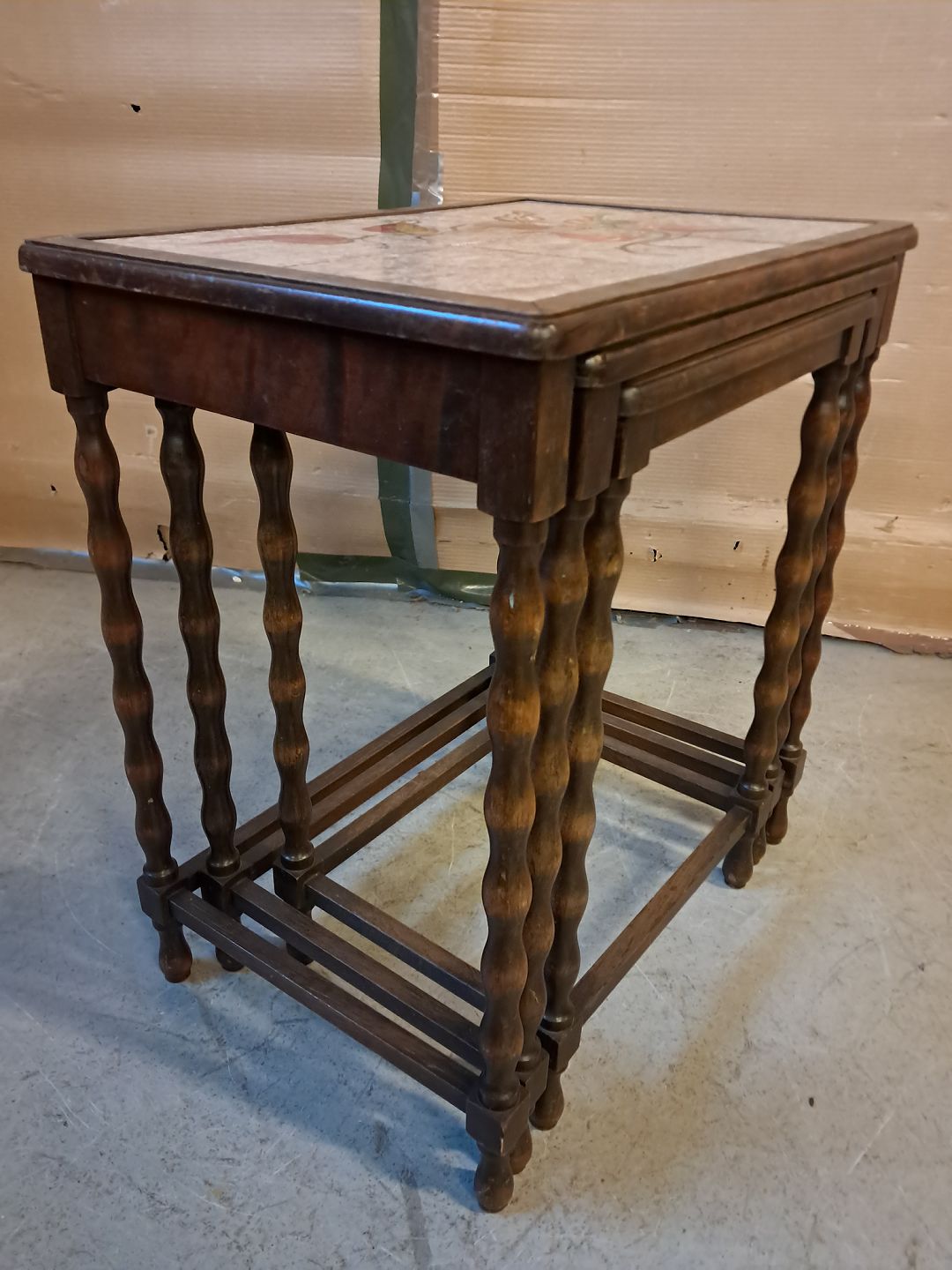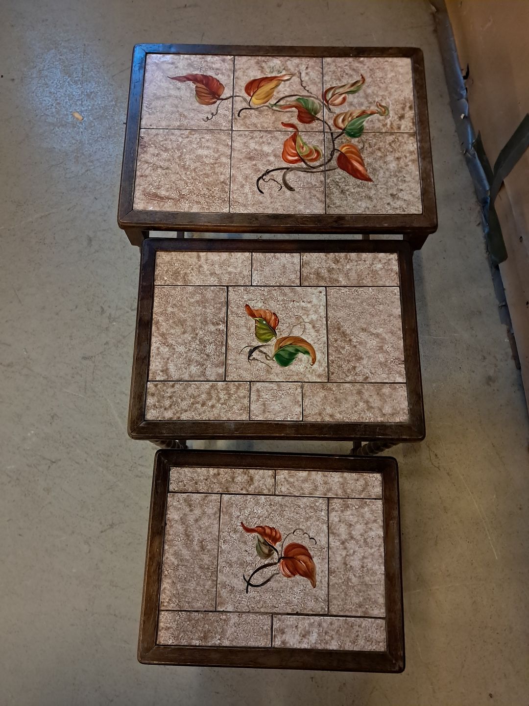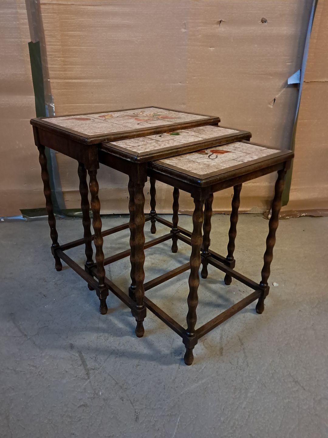 3 Indskudsborde i birketræ med kakler, fra 1930erne. De har brugsspor. Højde 56cm Bredde 51cm Dybde 36cm Emne nummer: 76137