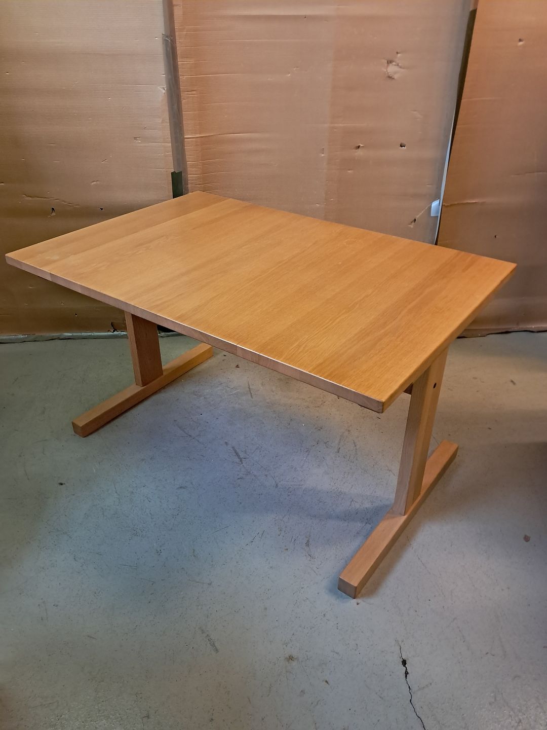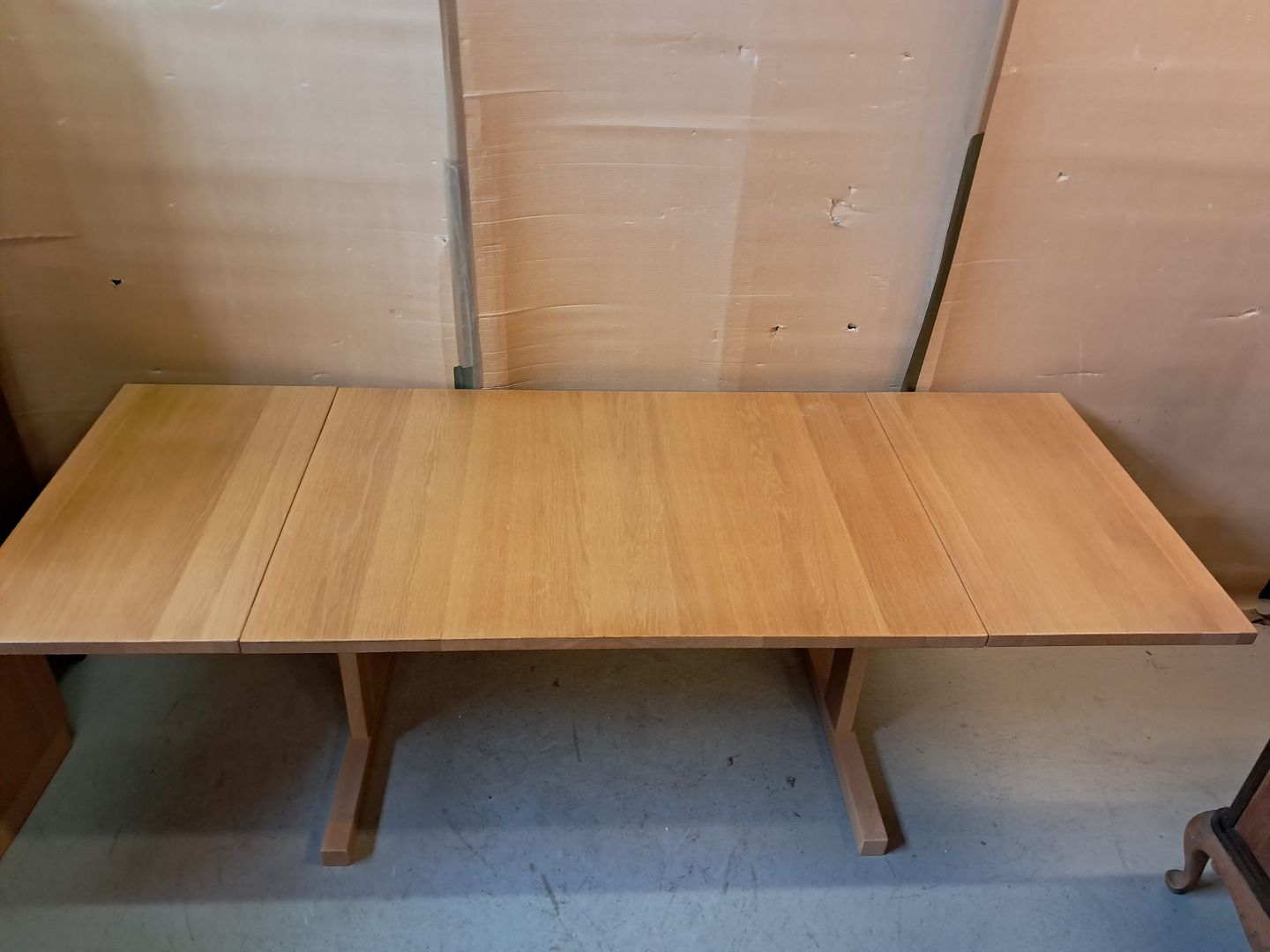 Spisebord med 2 tillægsplader i massivt egetræ, fra 1980erne. Det har brugsspor. Højde 73cm Bredde 88cm Længde 130cm Længde med tillægsplader 230cm Emne nummer: 76213