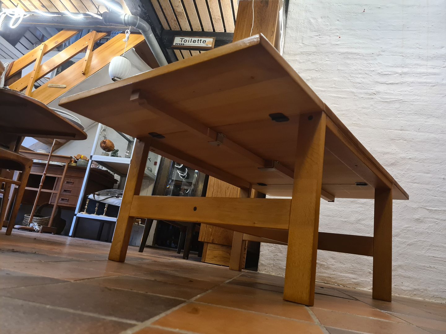 Dansk møbelproducent sofabord m. klapper udført i massiv lakeret egetræ. Fremstillet ca. 1970'erne. Pæn original stand. Mål: H. 47 cm. L. 73 cm. B. 74 cm. Total længde m. klapper 133 cm. Emne nummer: 80783