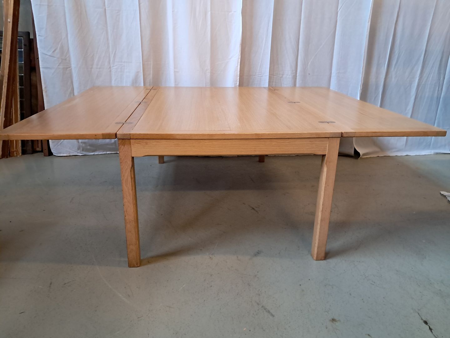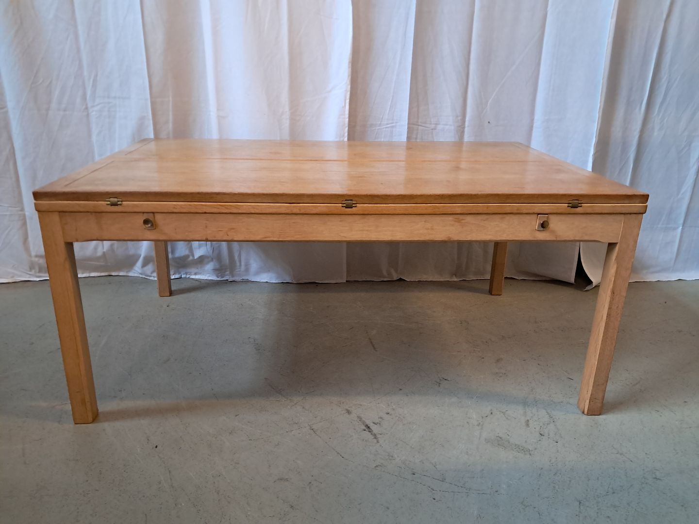 Sofabord i fineret egetræ, fra 1960erne. Det har brugsspor. Højde 54cm Længde 124cm Bredde 76cm Bredde med klapper 138cm Emne nummer: 76542