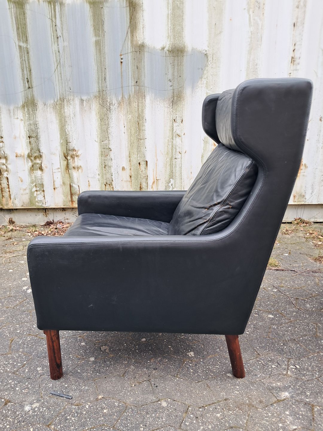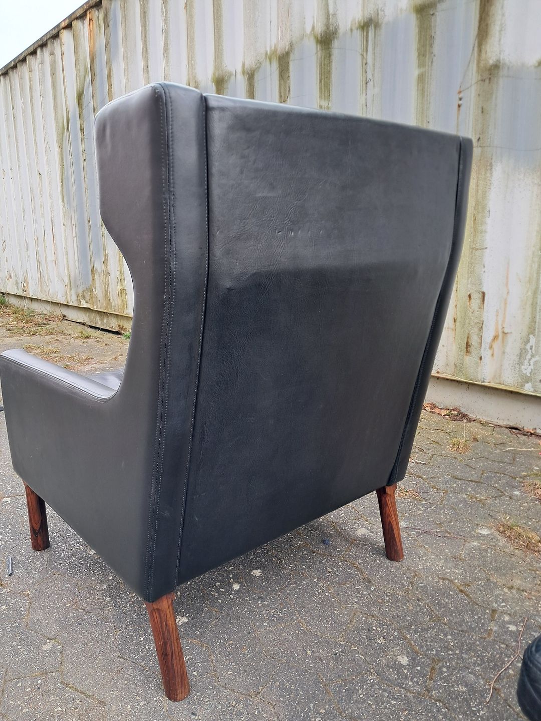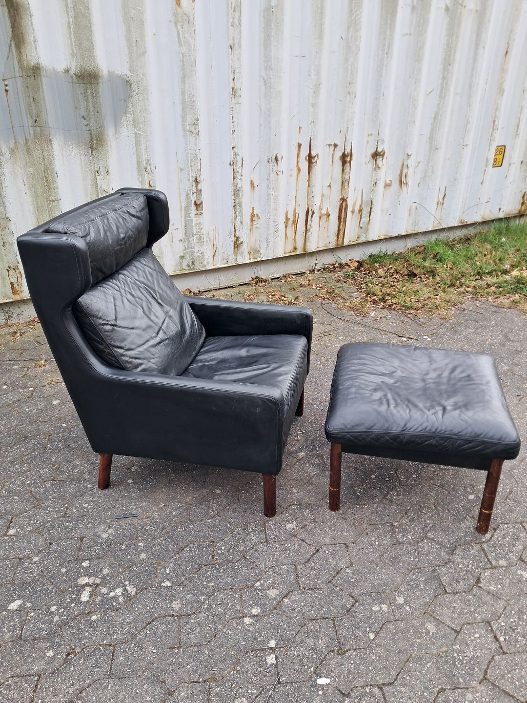 Fritz Hansen øreklapstol med fodskammel i læder, fra 1960erne. De har brugsspor. Ryghøjde 96cm Sædehøjde 42cm Emne nummer: 76621
