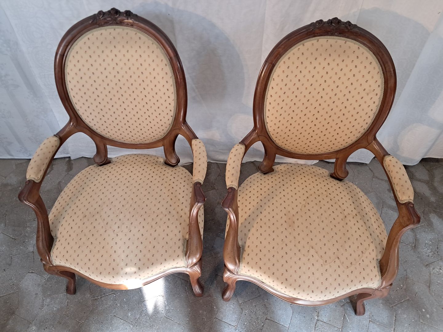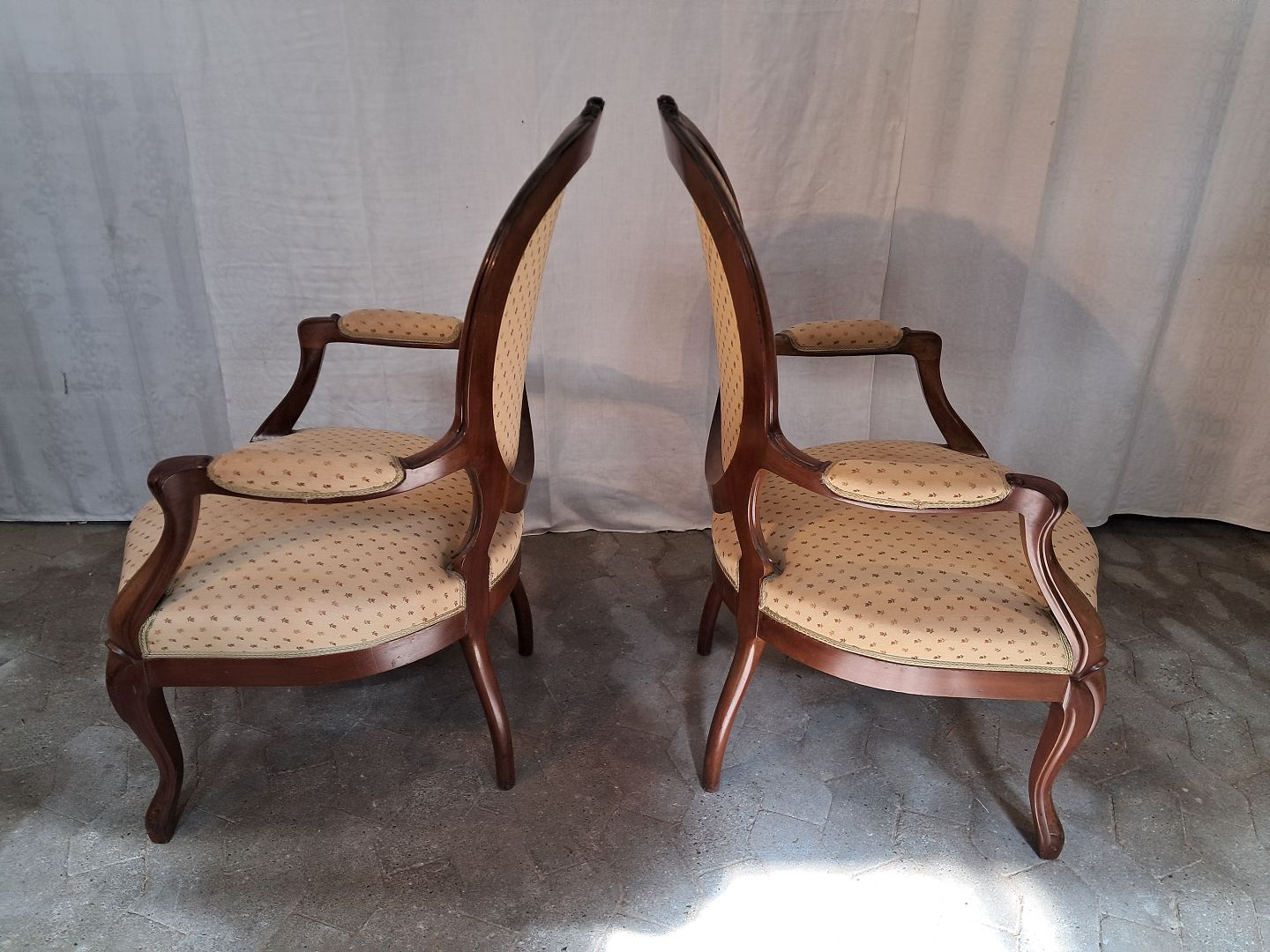 2 Armstole i mahogni, fra 1900erne. Betrækket har brugsspor. Ryghøjde 100cm Sædehøjde 41cm Emne nummer: 91562