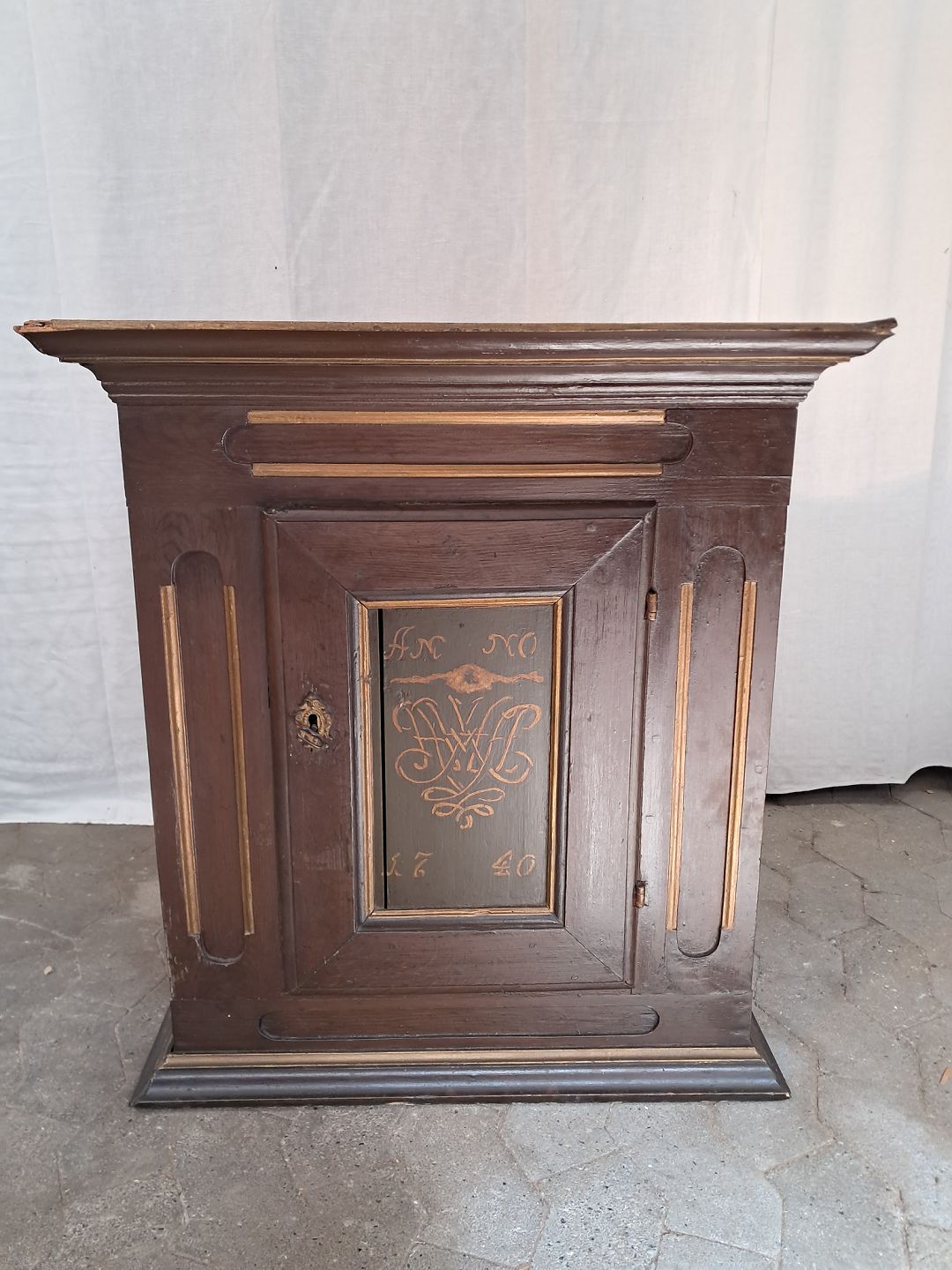 Vægskab i malet massivt fyrretræ, fra måske år 1740.