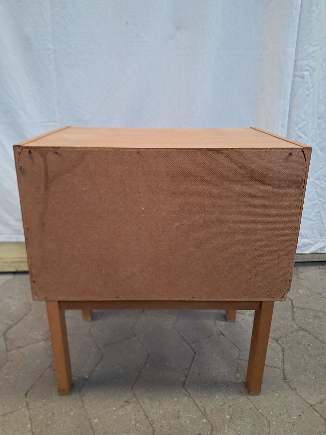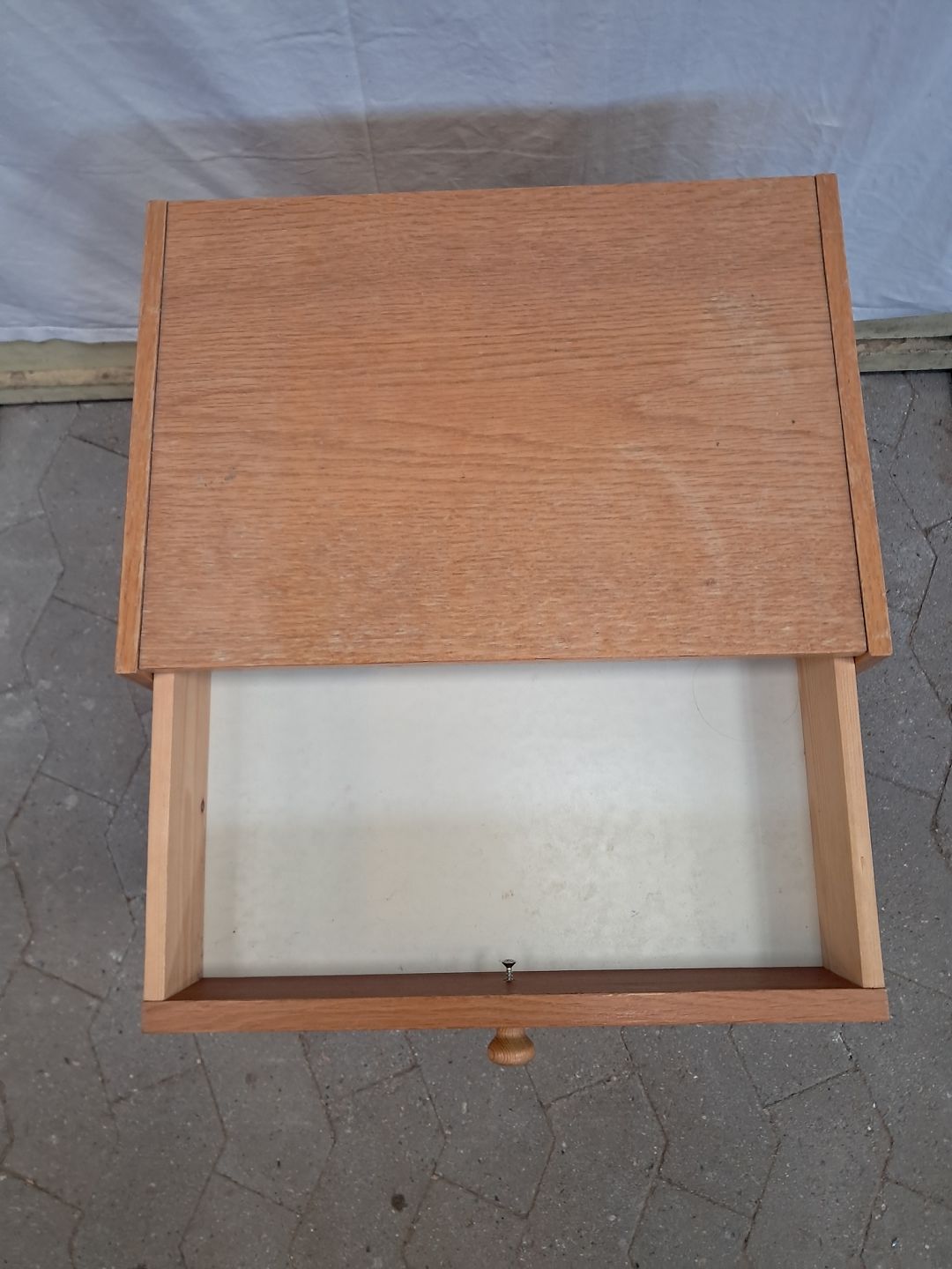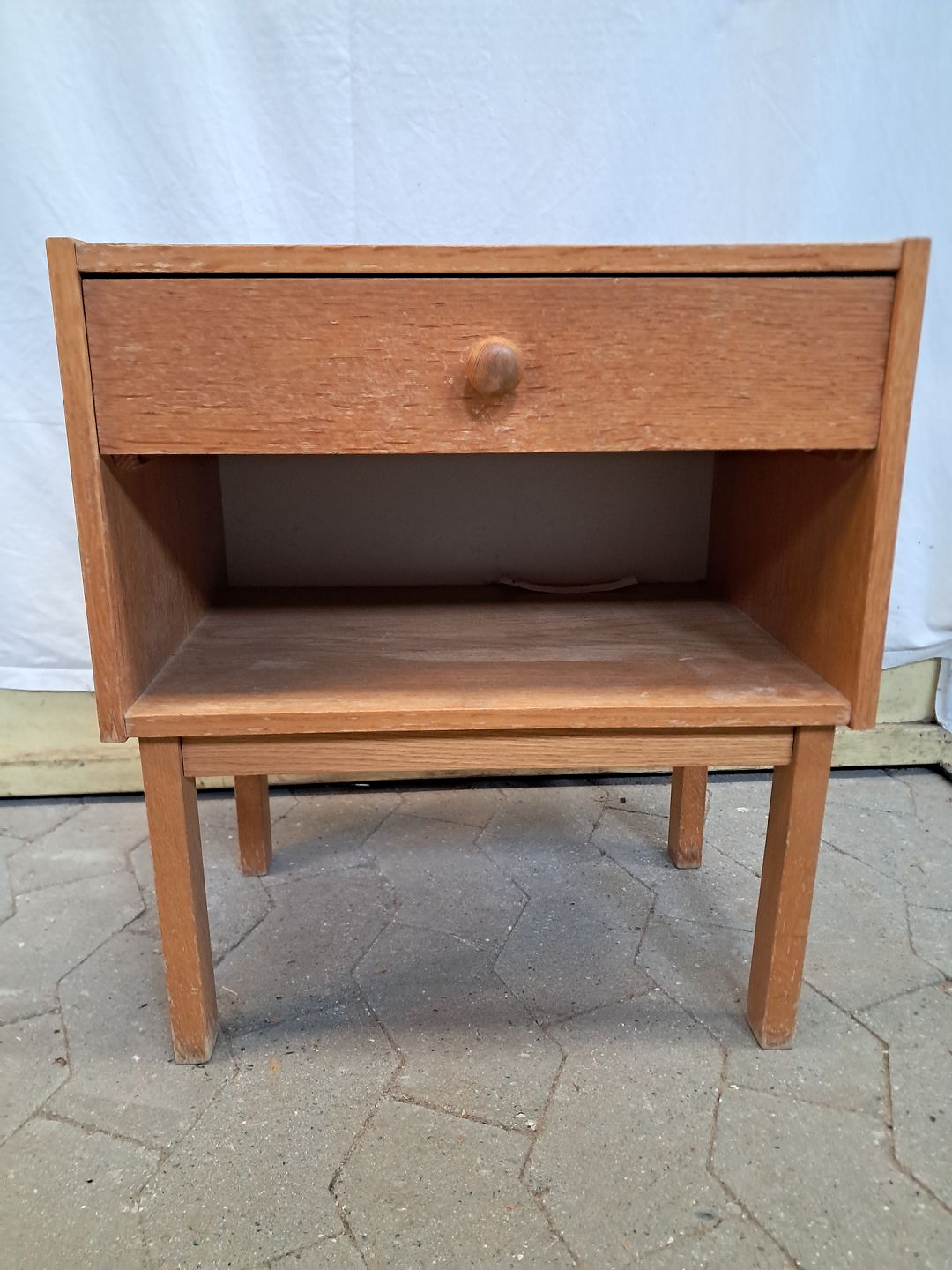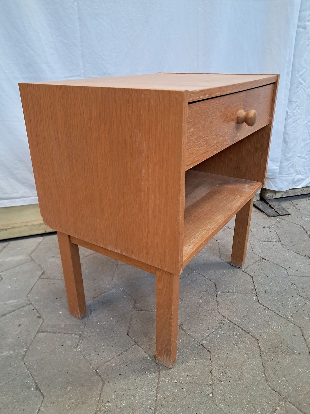 Natbord i fineret egetræ, fra 1970erne. Det har brugsspor. Højde 49cm Bredde 43cm Dybde 30cm Emne nummer: 91579