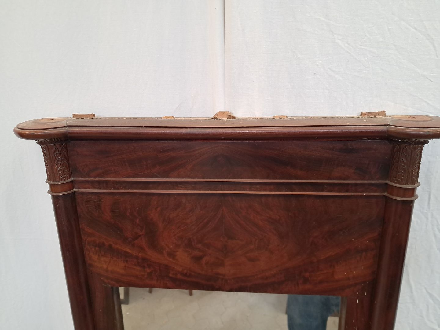 Spejl i fineret mahogni, fra 1910erne. Det har brugsspor og forringet spejlbillede. Højde 155cm Bredde 72cm Emne nummer: 91595