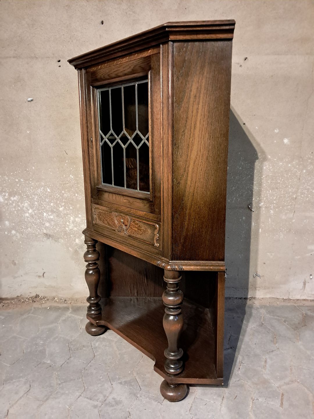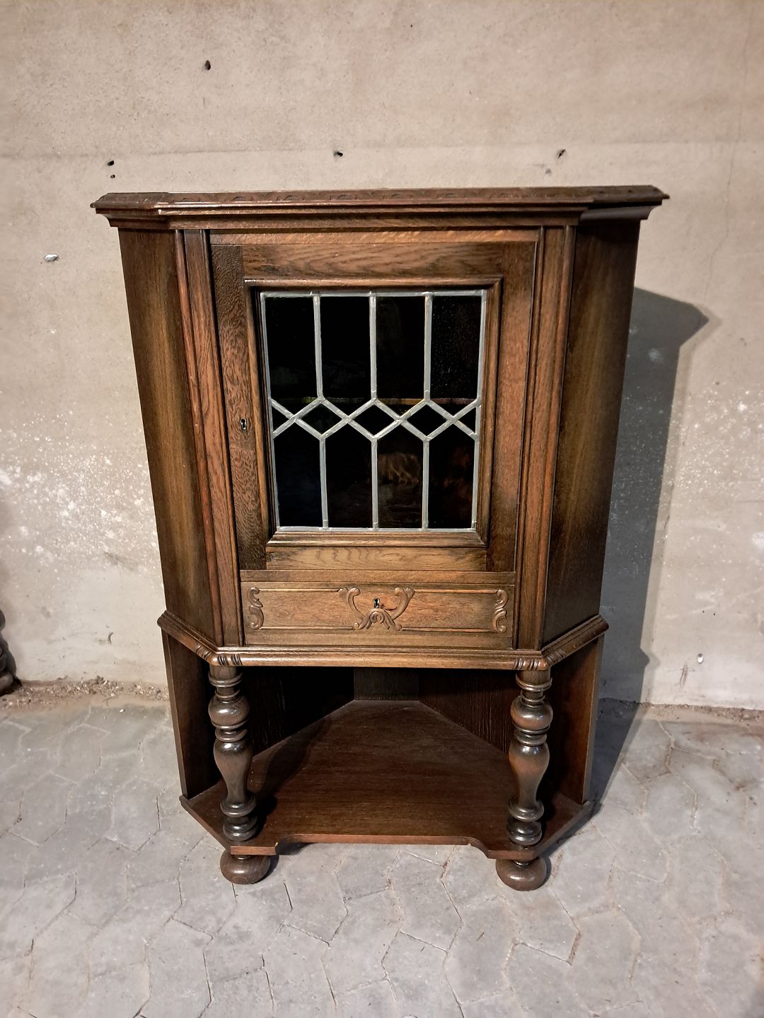 Hjørneskab i fineret egetræ, fra 1950erne. Det har brugsspor. Højde 127cm Bredde 85cm Dybder 61cm Emne nummer: 91610