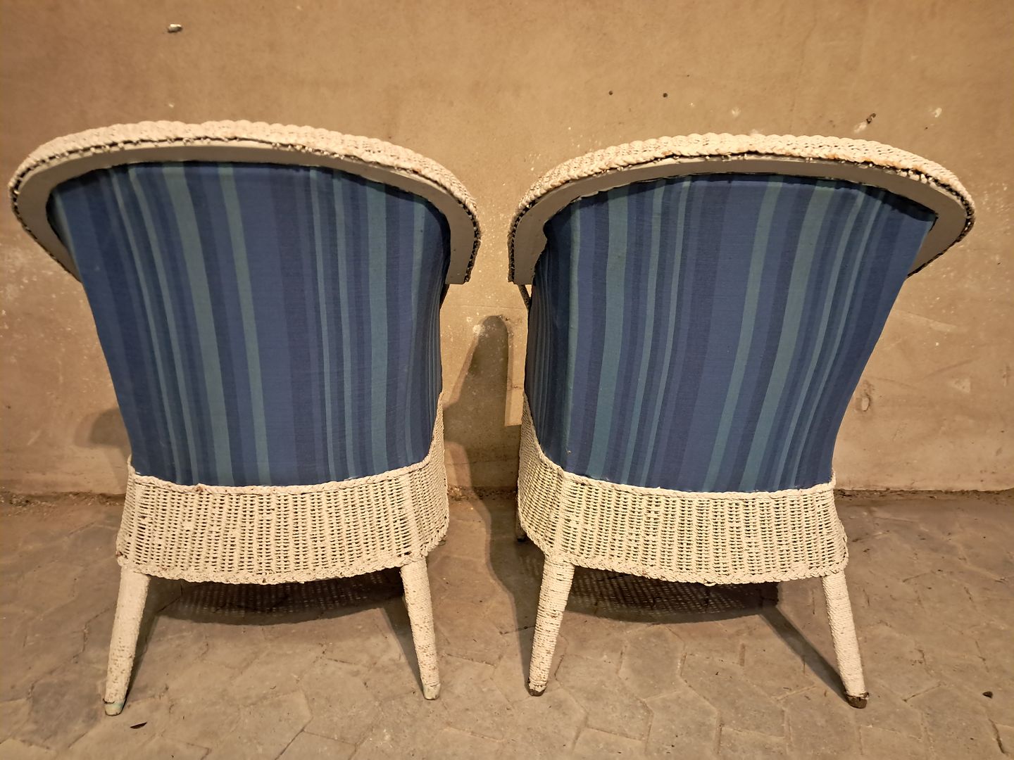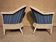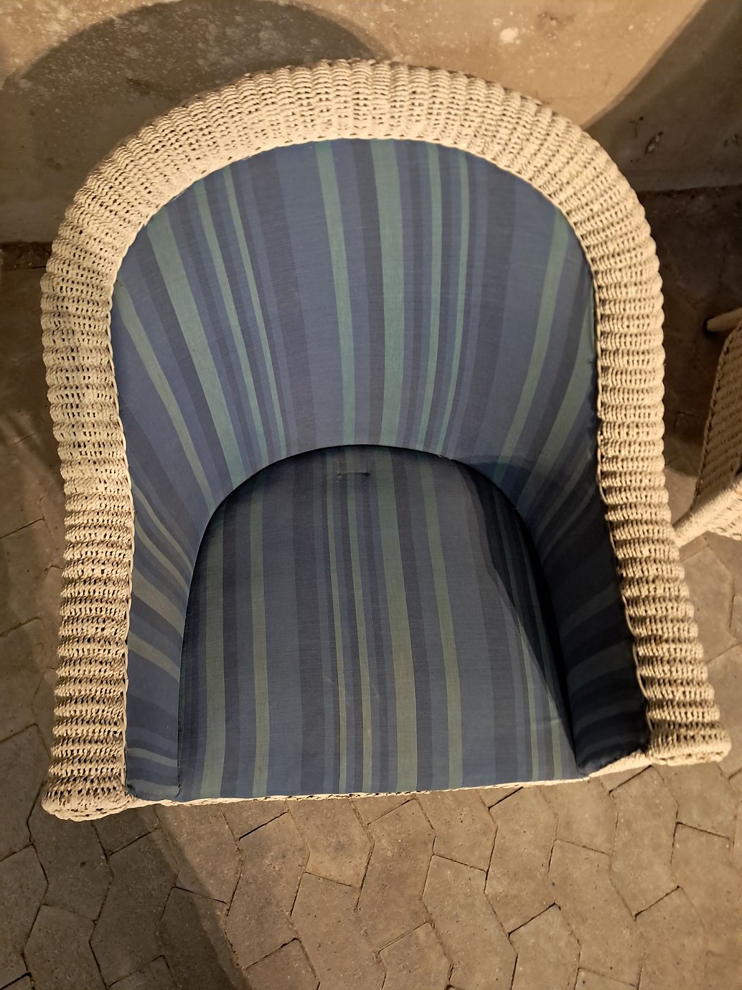 2 Malede kurvestole, fra 1980erne. Betrækket er slidt/solbleget, men intakt. Ryghøjde 85cm Sædehøjde 43cm Emne nummer: 91627