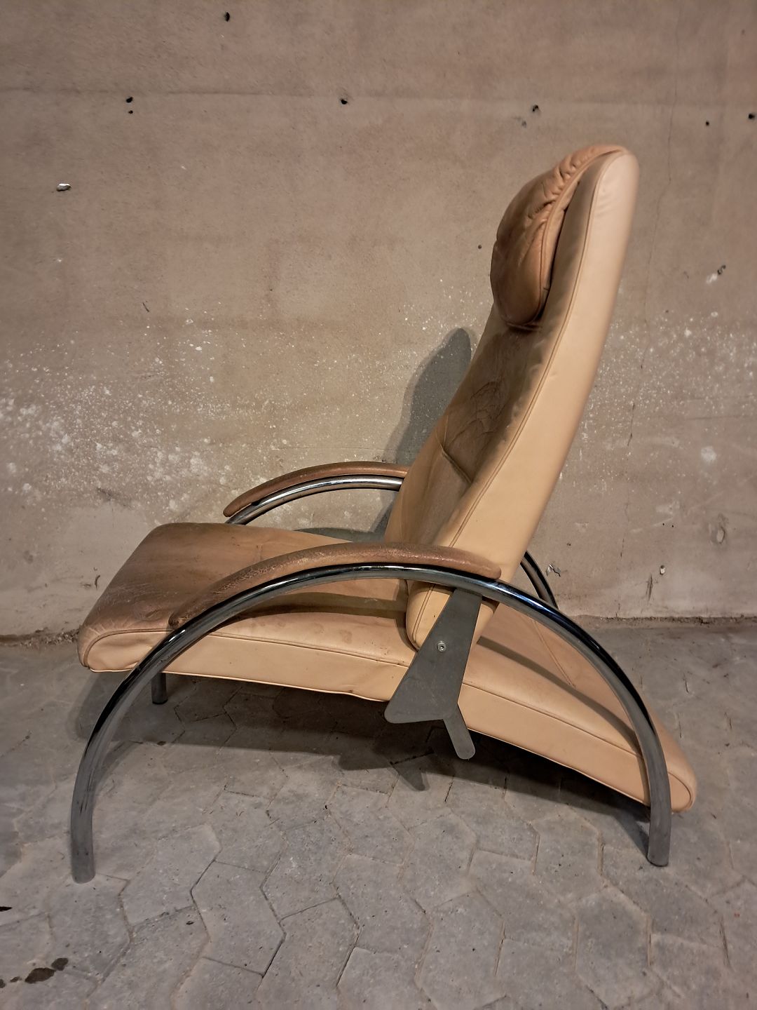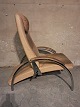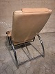 Lænestol i metal og læder, fra 1980erne. Den er designet af Ingmar Relling. Den har brugsspor og læderet er godt brugt. Rughøjde 109cm Sædehøjde 42cm Emne nummer: 91631