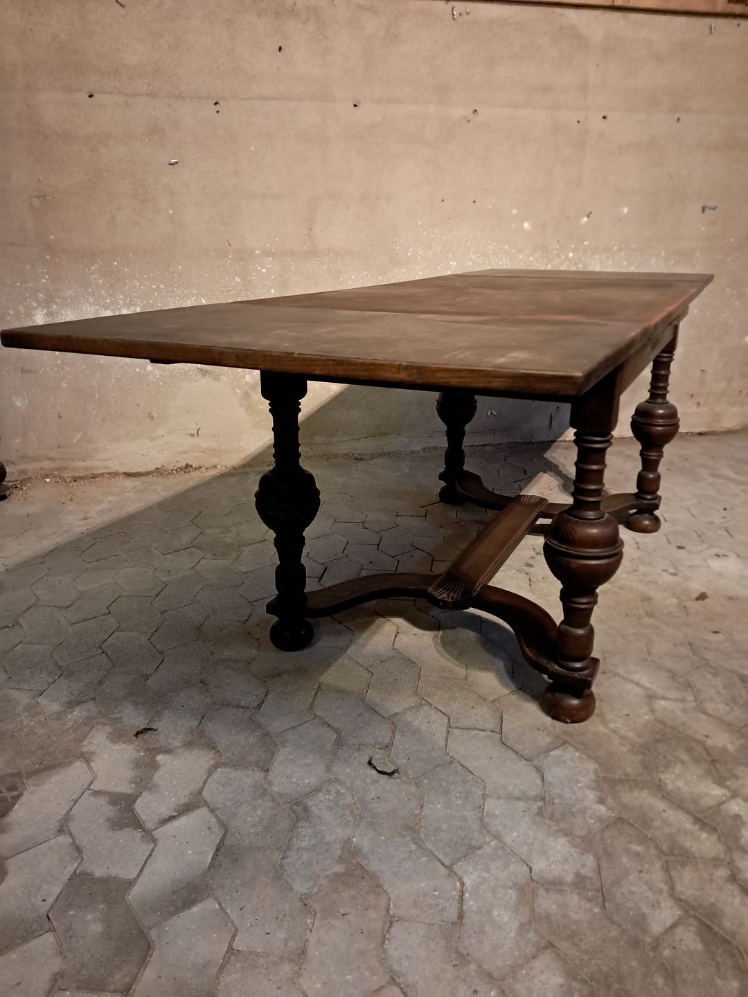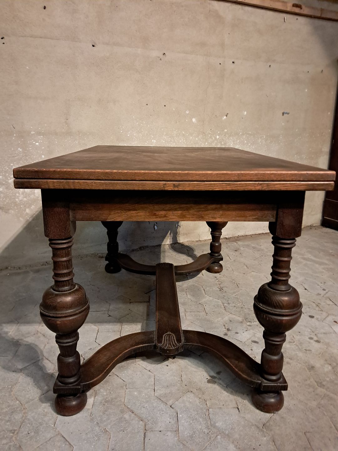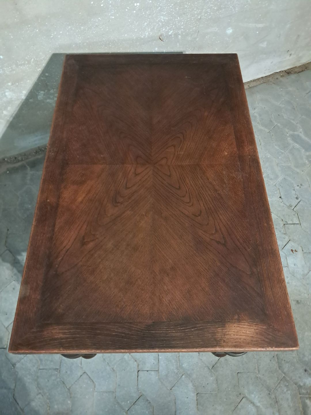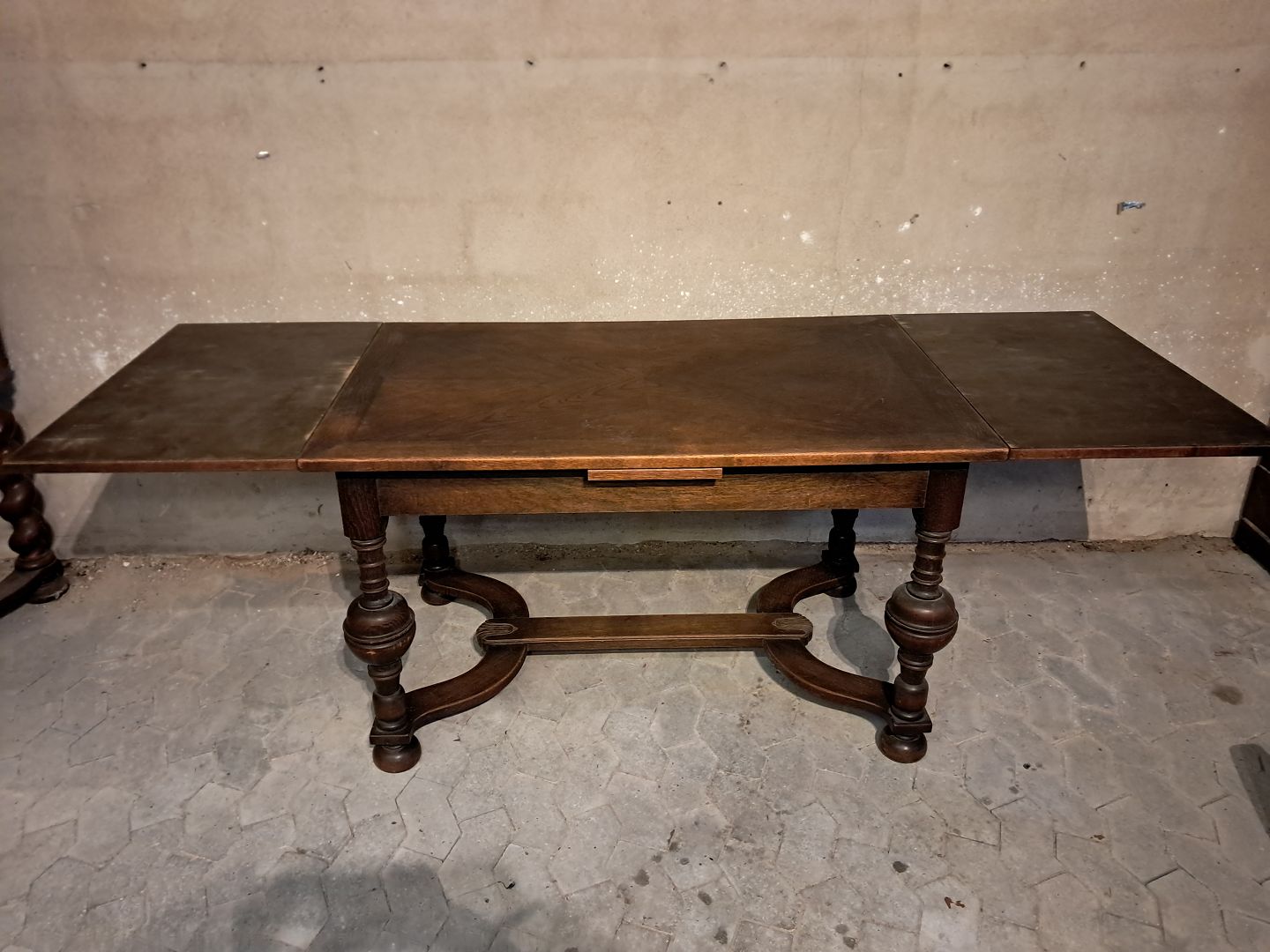 Bord i fineret egetræ med hollandsk udtræk, fra 1930erne. Det har brugsspor. Højde 76cm Bredde 126cm Længde 126cm Længde med udtræk 228cm Emne nummer: 91635
