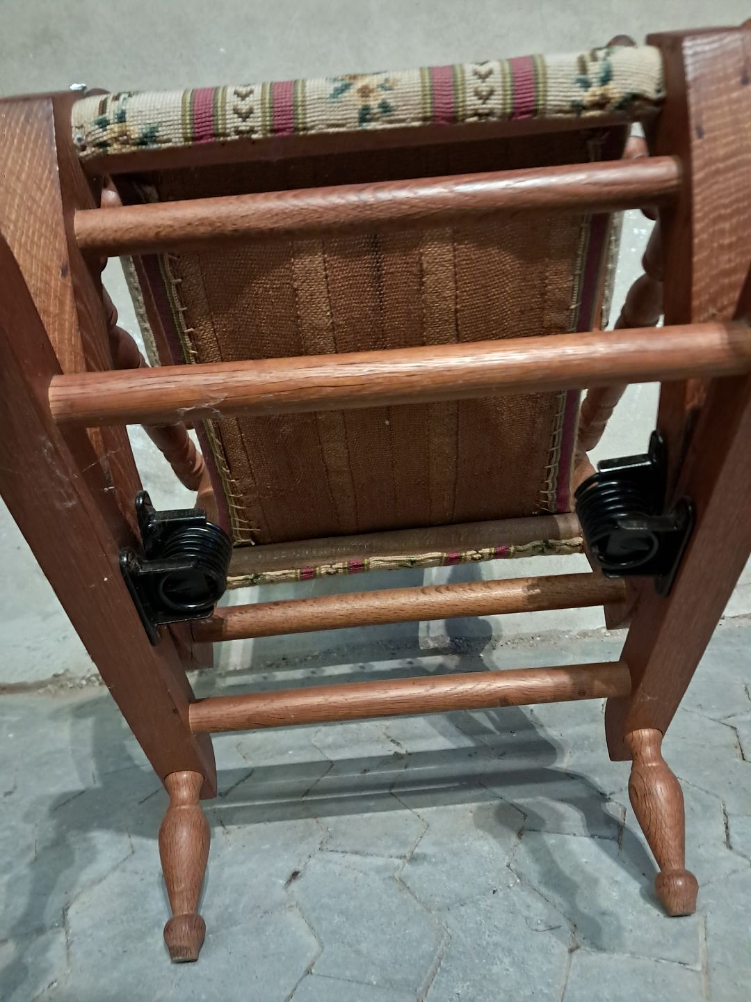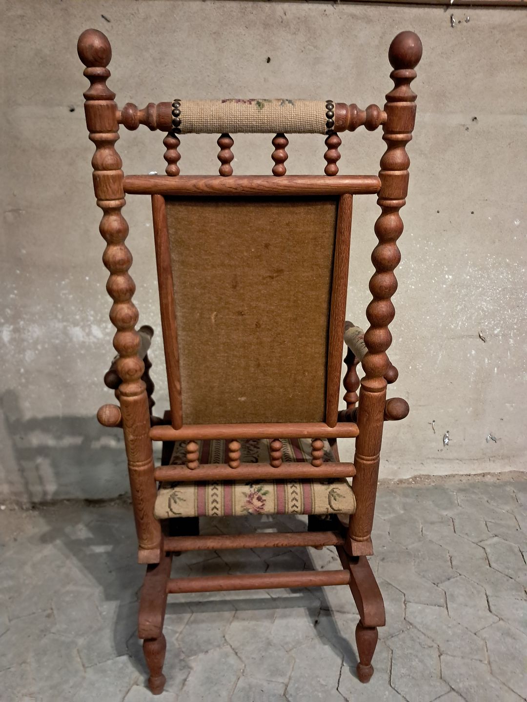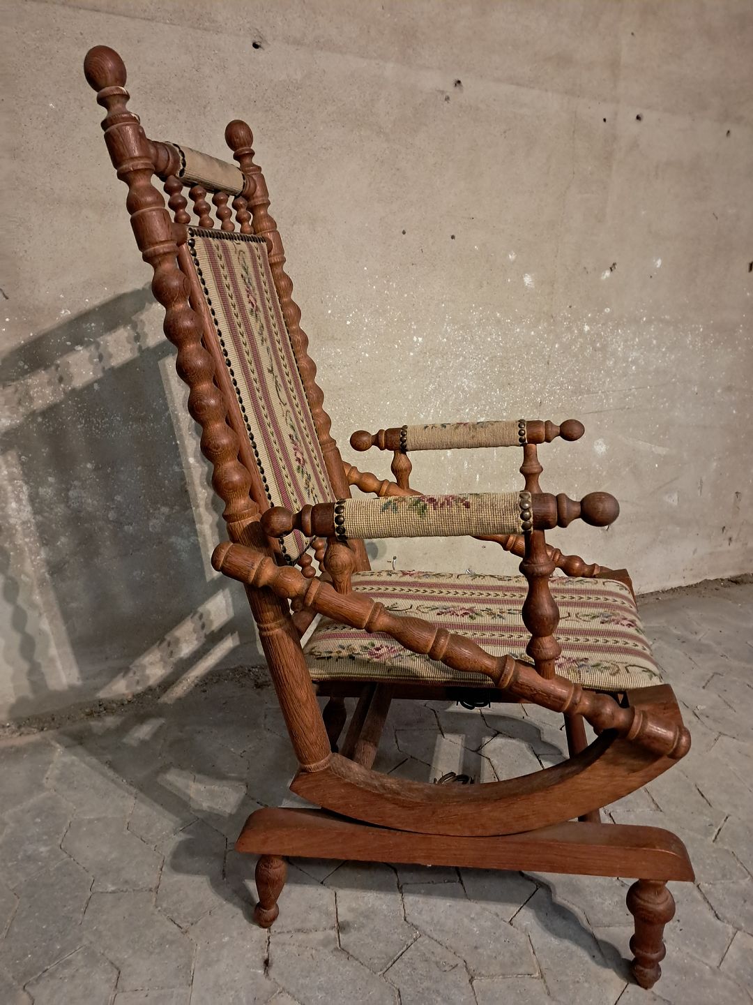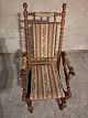 Rokkestol i massivt egetræ, fra 1980erne. Den har brugsspor. Ryghøjde 115cm Sædehøjde 44cm Emne nummer: 91654