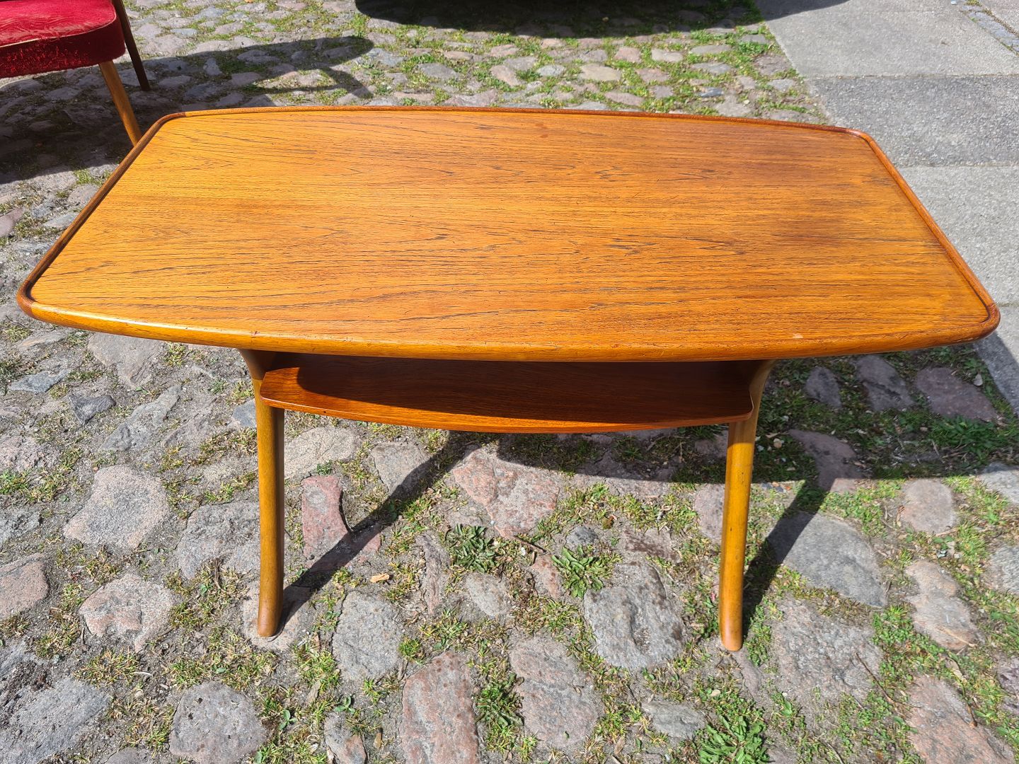 Dansk møbelproducent sofabord i fineret teak med underhylde samt stel i egetræ. Fremsillet ca. 1960'erne. Pæn brugt stand. Mål: H. 59 cm. L. 99 cm. B. 54 cm. Emne nummer: 80842