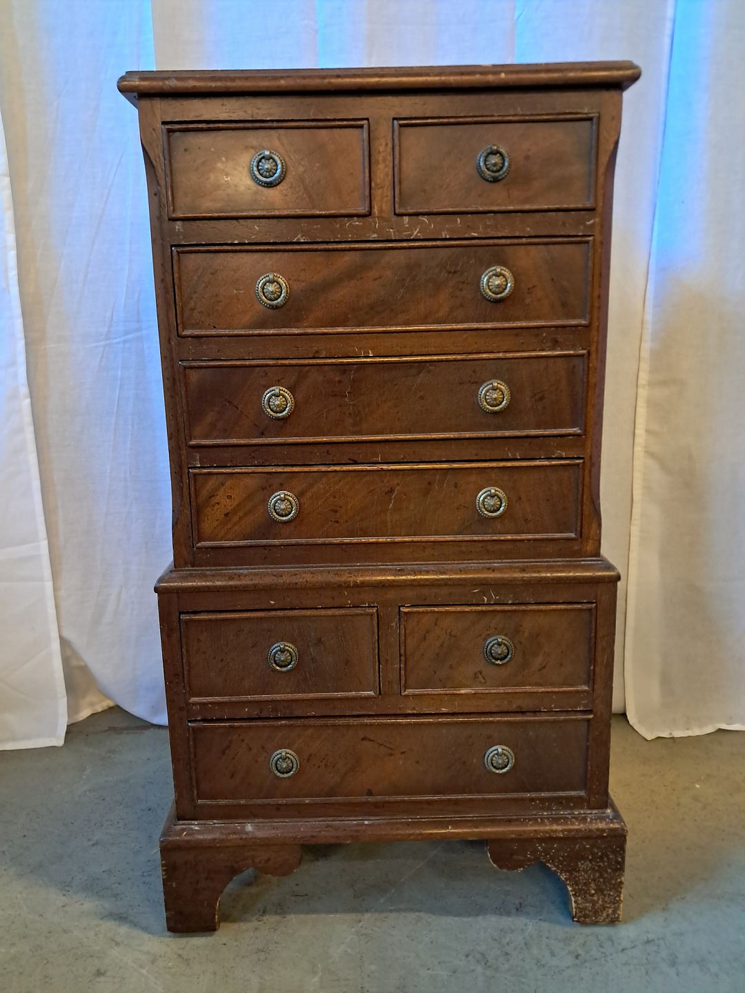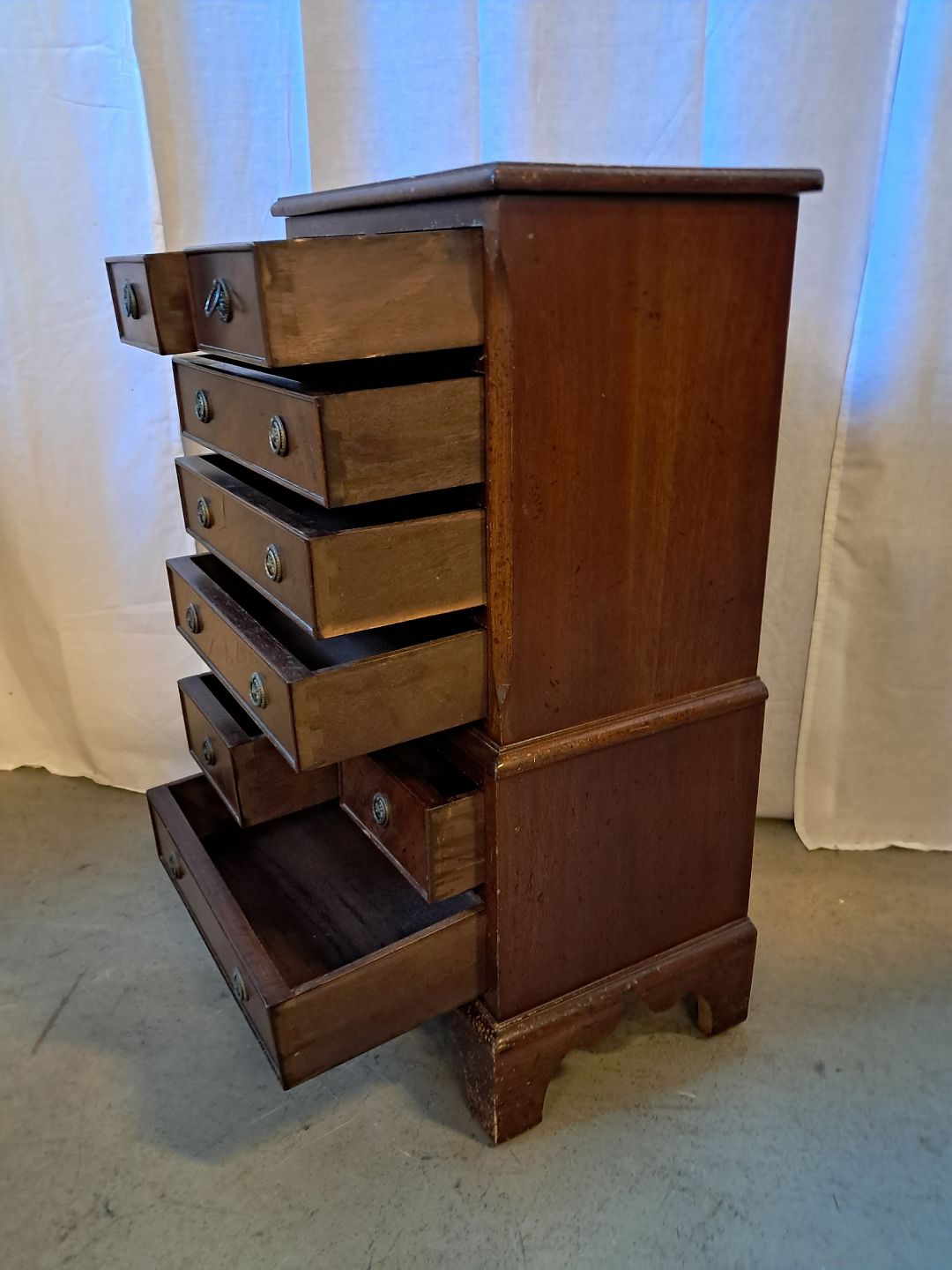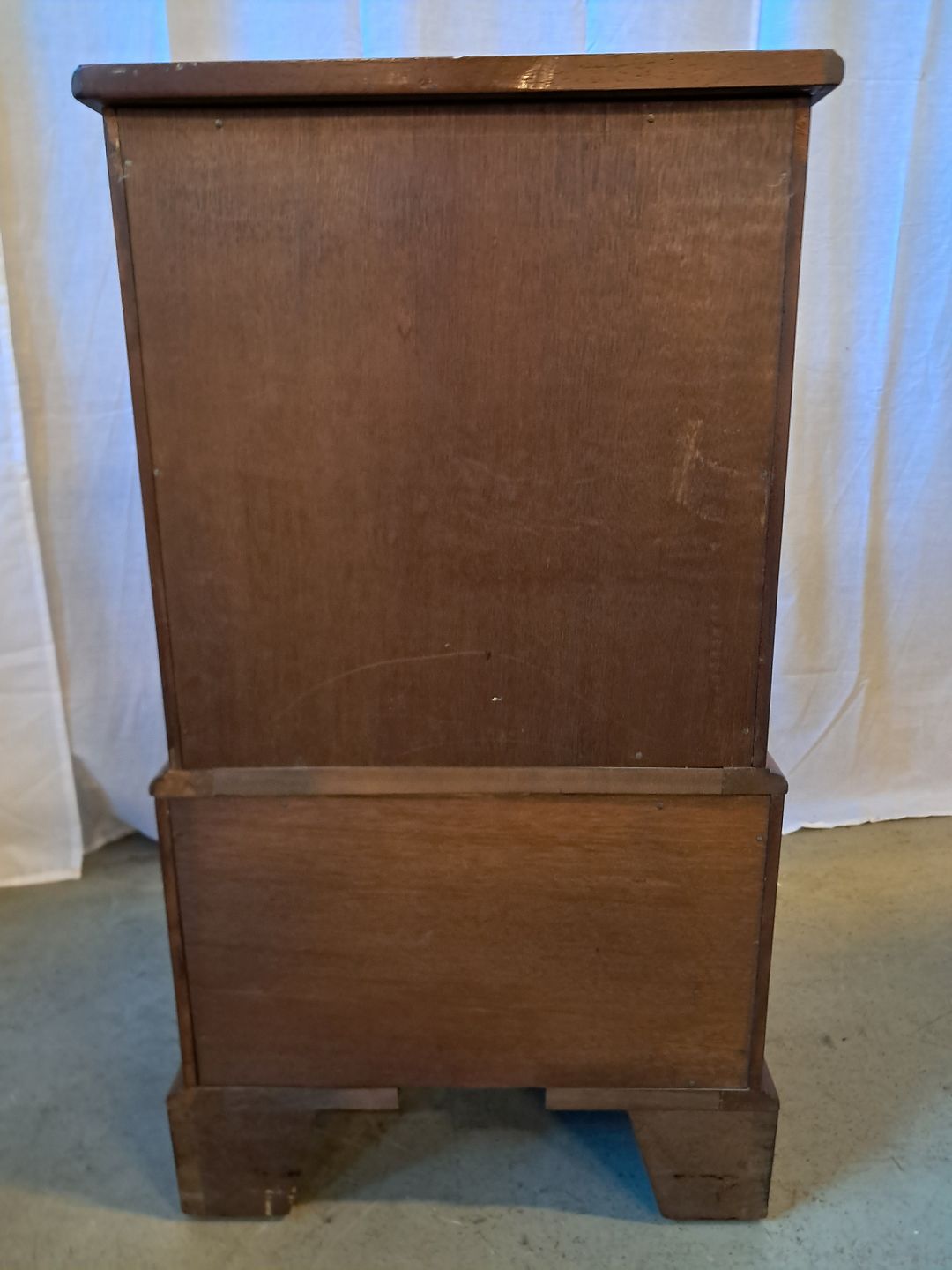 Kommode i fineret mahogni, fra 1980erne. Den har brugsspor i form af ridser. Højde 80cm Bredde 42cm Dybde 30cm Emne nummer: 76660
