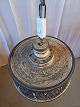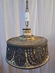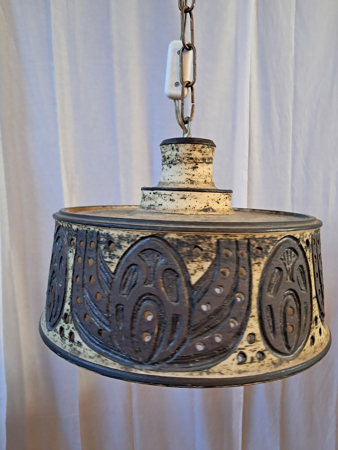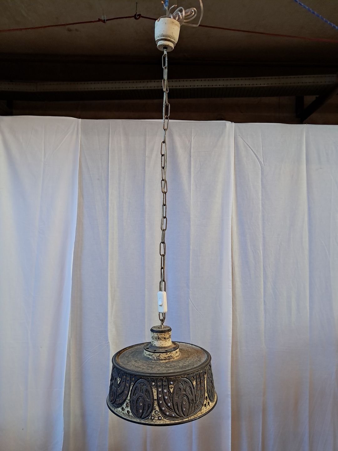 Loftlampe i keramik med metalkæde, fra 1970erne. Højde 22cm Diameter 30cm Højde med kæde 108cm Emne nummer: 76697