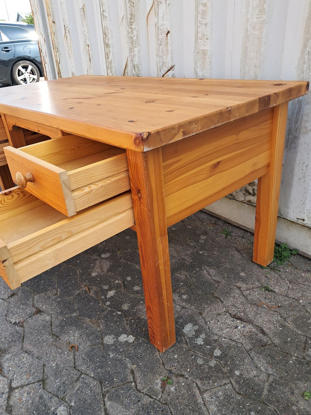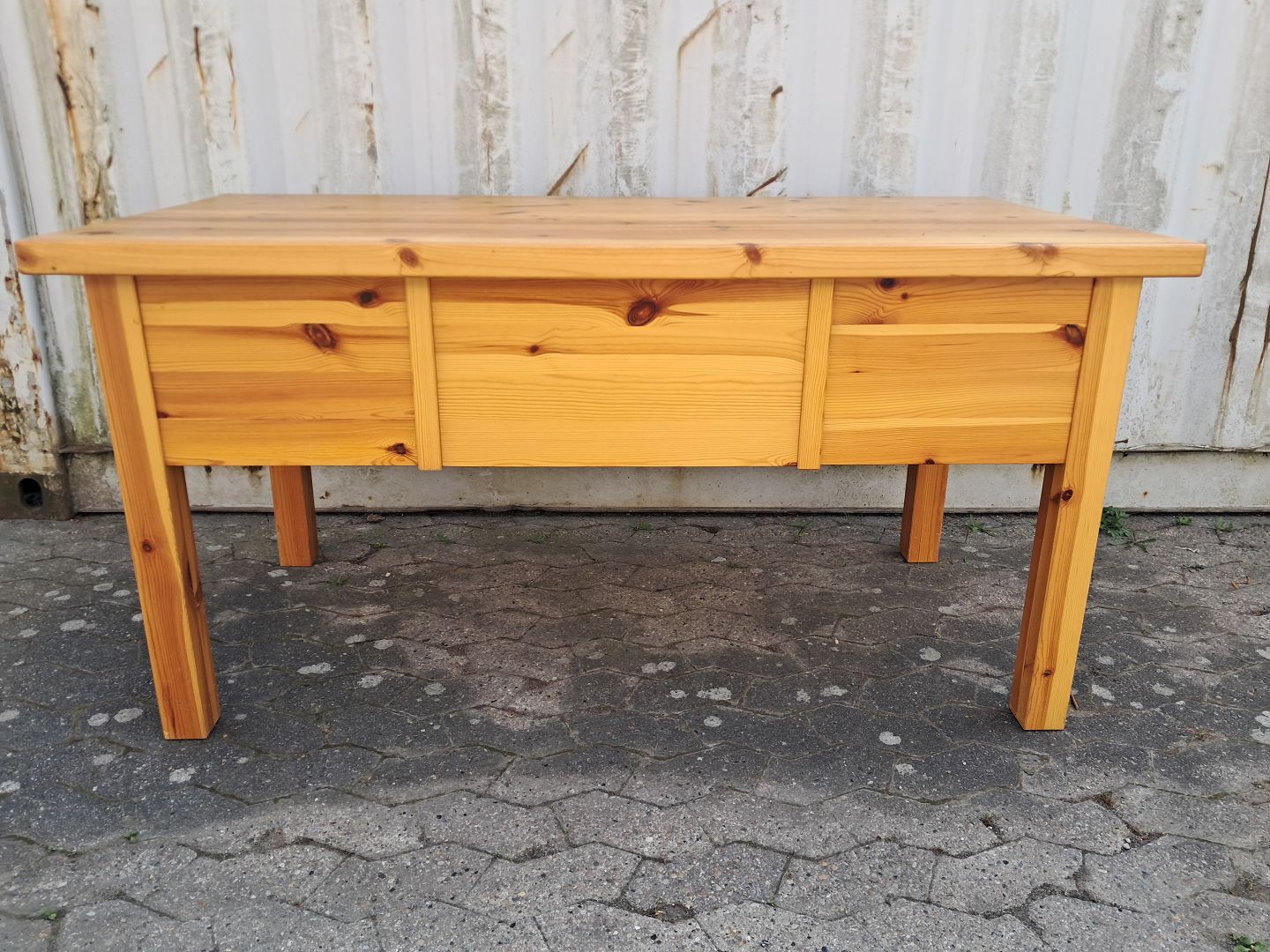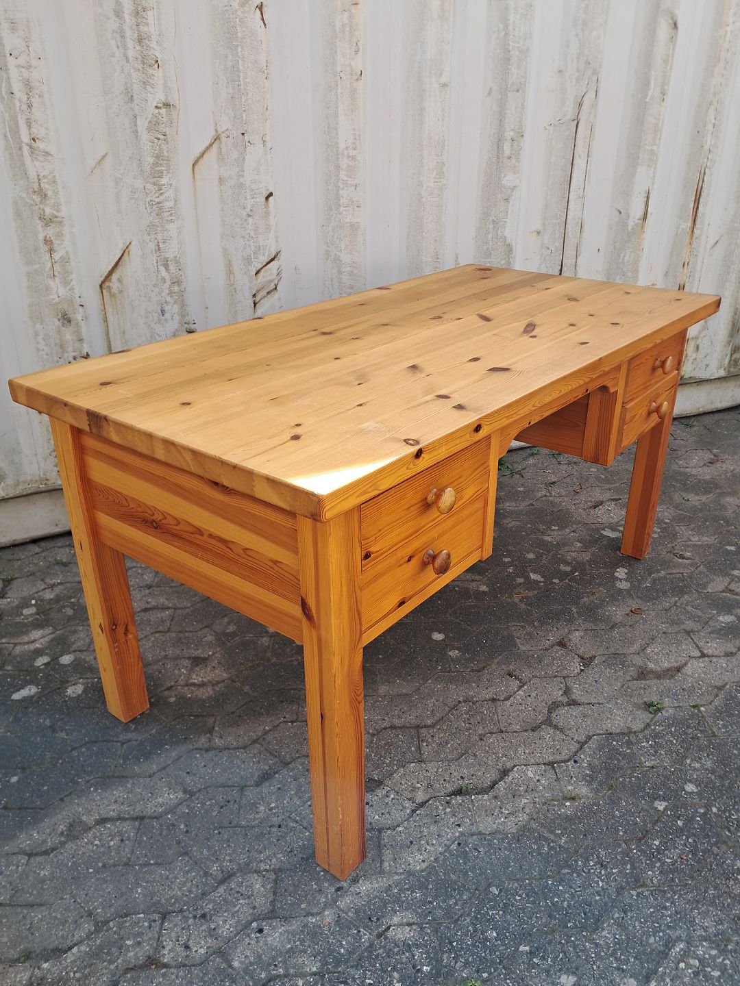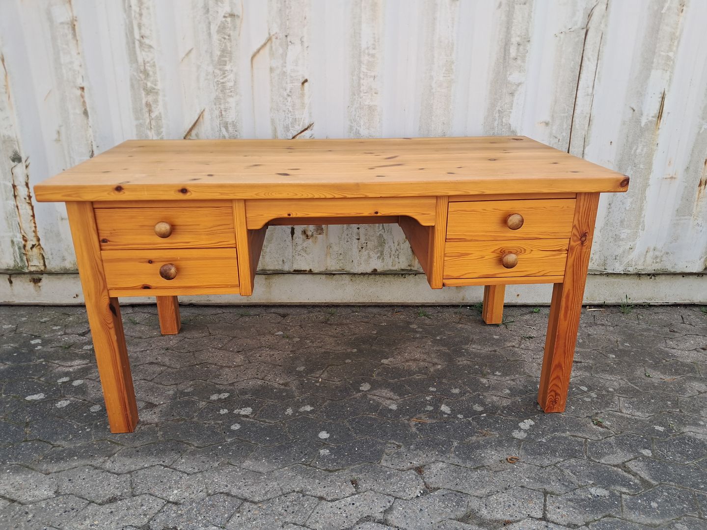 Skrivebord i massivt fyrretræ, fra 1980erne. Det har brugsspor. Højde 75cm Bredde 147cm Dybde 75cm Højde fra gulv til underkant 63cm Pladetykkelse 4cm Emne nummer: 76710