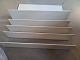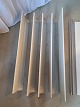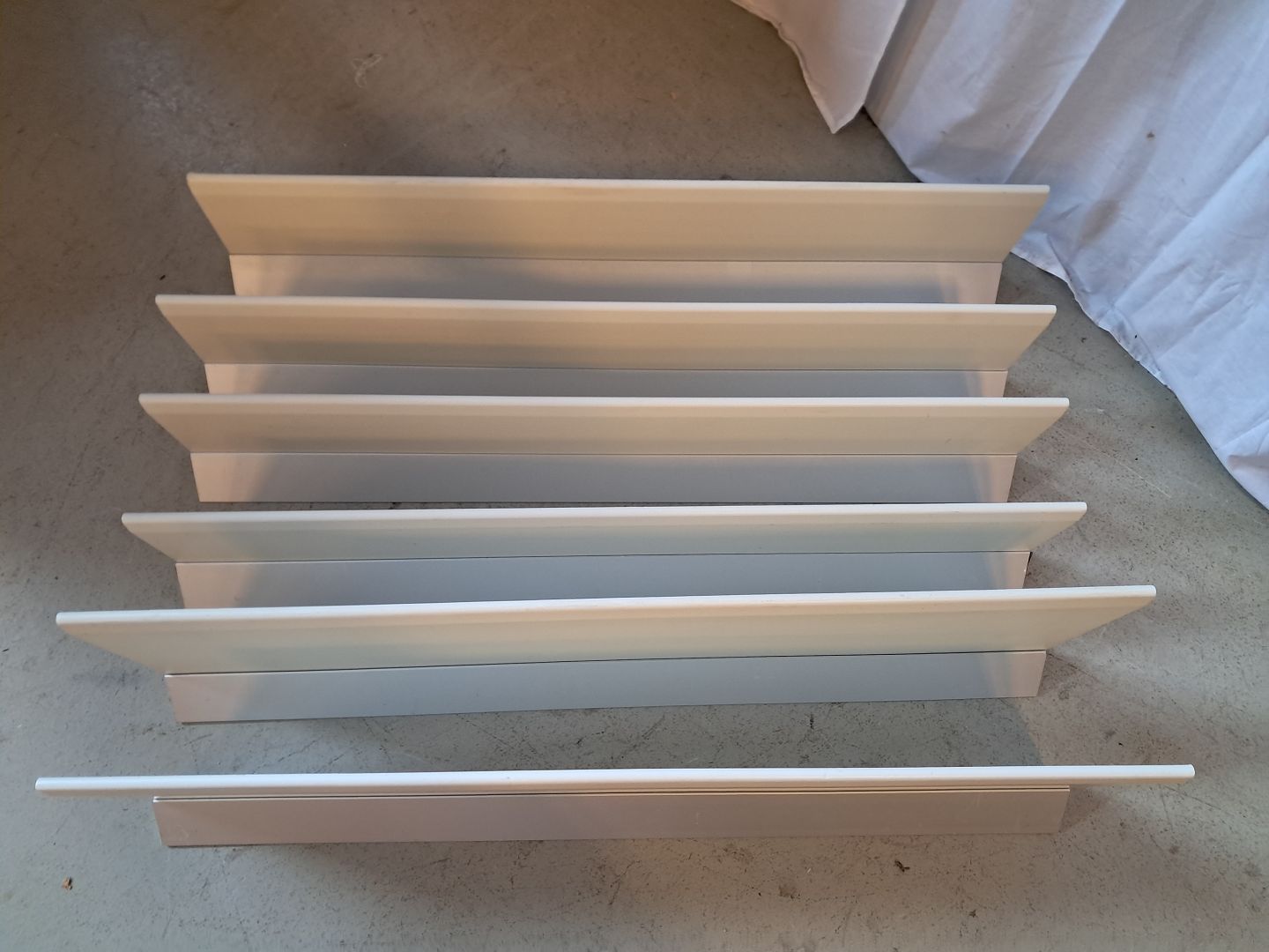 6 Hylder i malet træ med kraftige aluminiumsskinner, fra 1990erne. De har brugsspor. 2 Hylder måler : Bredde 105cm Dybde 30cm 4 Hylder måler : Bredde 105cm Dybde 20cm Alu-skinne højde 7cm Emne nummer: 76816