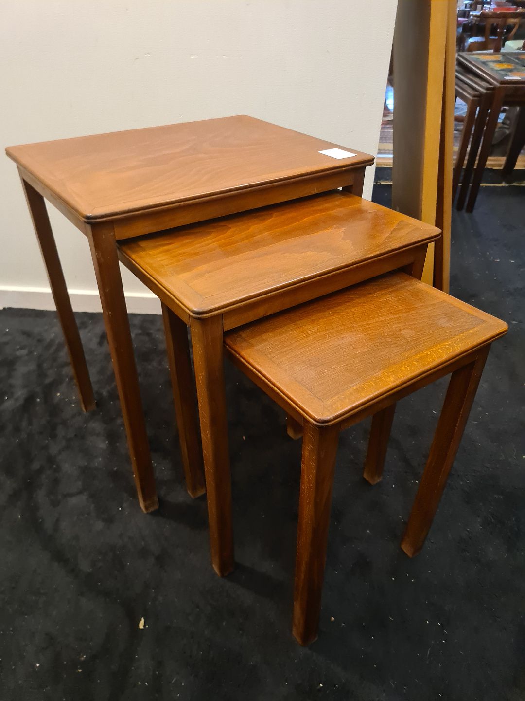 Dansk møbelproducent sæt indskudsborde i fineret/bejdset mahogni. Fremstillet ca. 1950'erne. Pæn brugt stand. Mål: H. 54 cm. B. 46 cm. D. 38 cm. Emne nummer: 80878