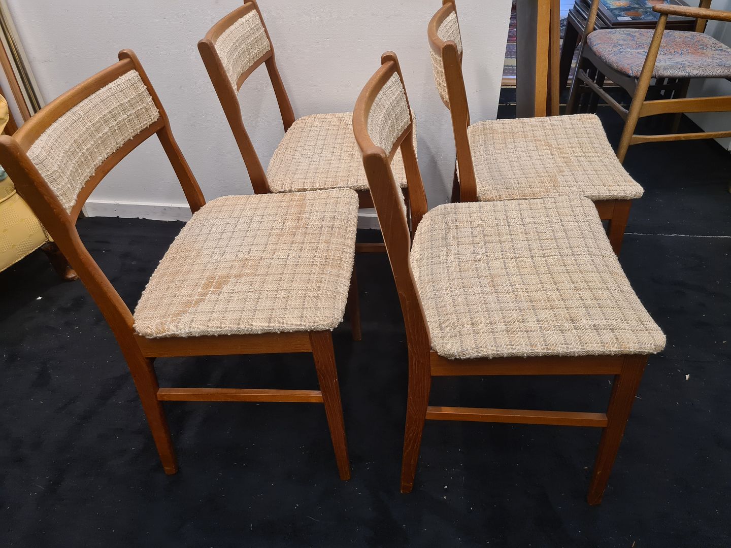 Vestervig Eriksen sæt af 4 spisebordsstole i teak betrukket m. uldstof. Fremstår i brugt stand, bør ombetrækkes. Fremstillet ca. 1960'erne. Mål: H. 73 cm. B. 46 cm. D. 48 cm. SH. 46 cm. Emne nummer: 80882