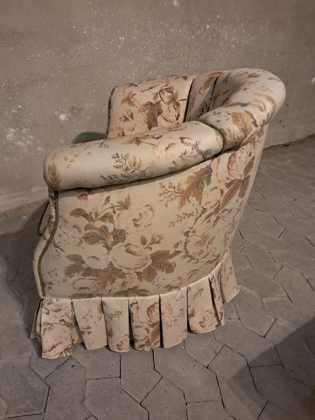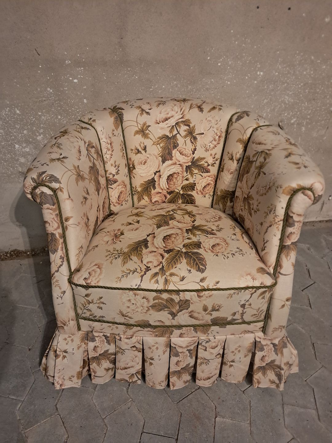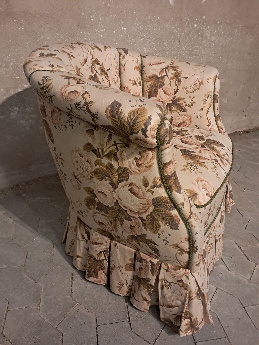 Lænestol med blomstret betræk, fra 1950erne.