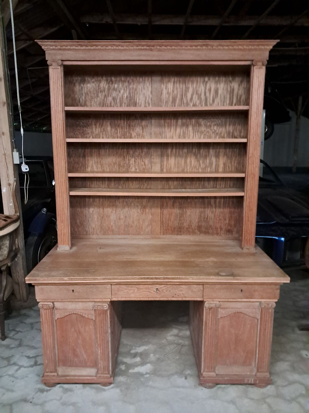Skrivebord i fineret og massivt egetræ, fra 1920erne. Det har brugsspor. Skrivebord : Højde 77cm Bredde 154cm Dybde 77cm Højde fra gulv til underkant 60cm Reol : Højde 141cm Bredde 147cm Dybde 32cm, Total højde 218cm Emne nummer: 91729