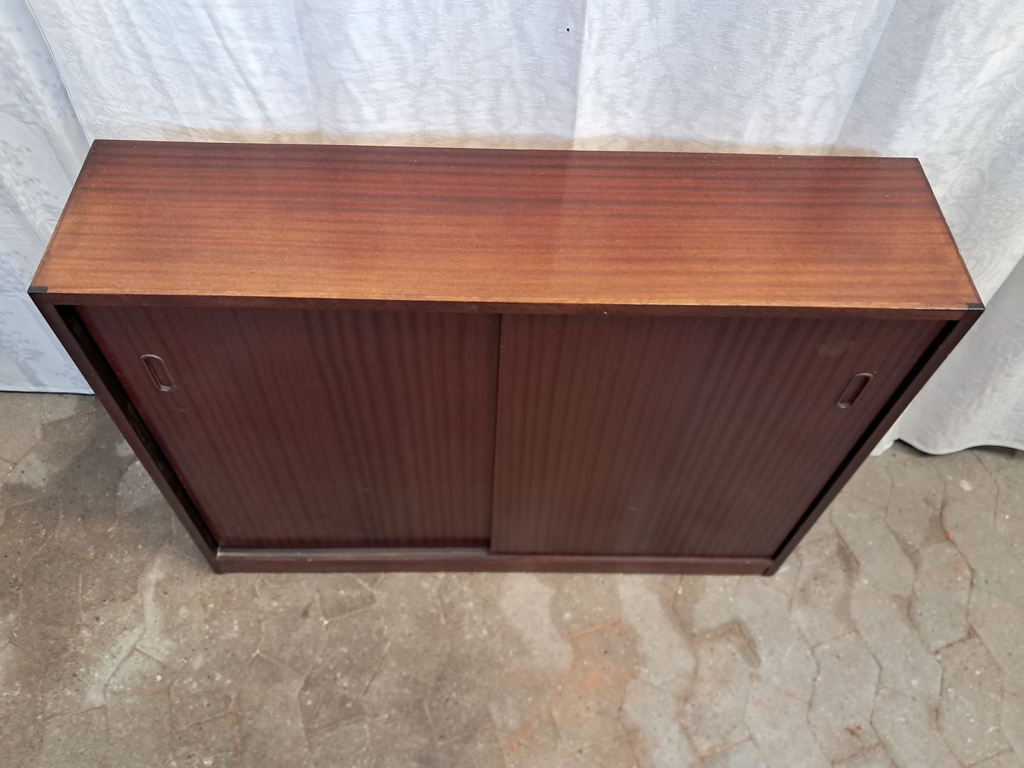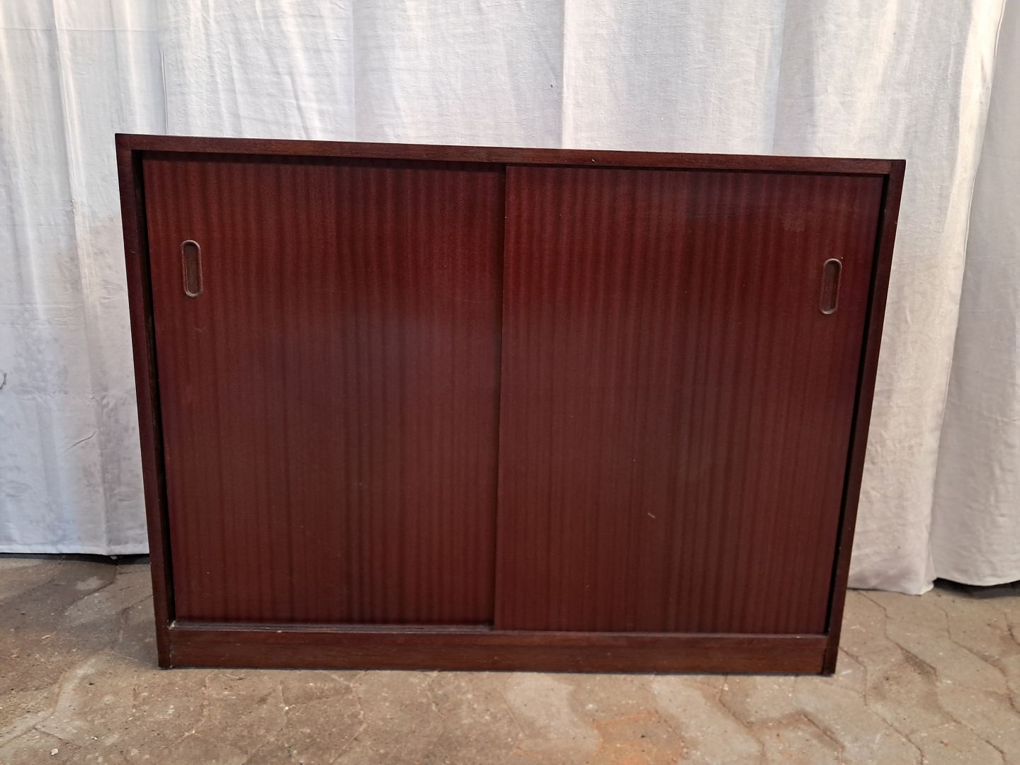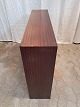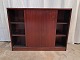 Reol i finert mahogni med skydelåger, fra 1980erne.