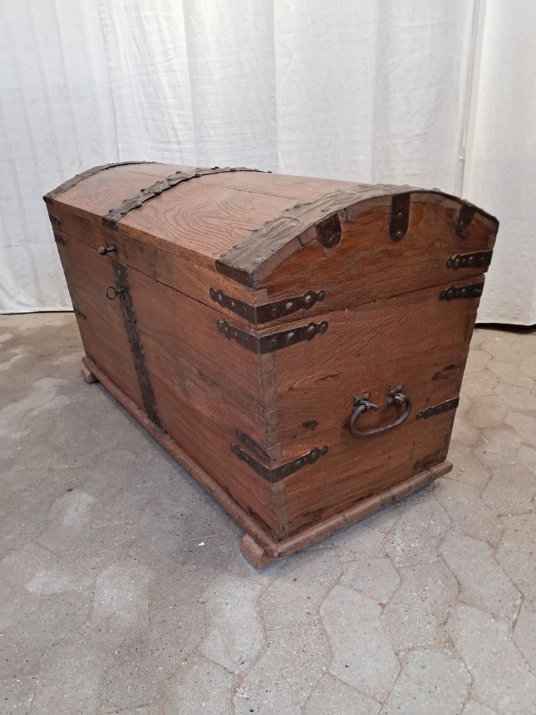 Kiste i massivt egetræ, fra 1860erne. Den har patina. Højde 70cm Bredde 121cm Dybde 58cm Emne nummer: 91775