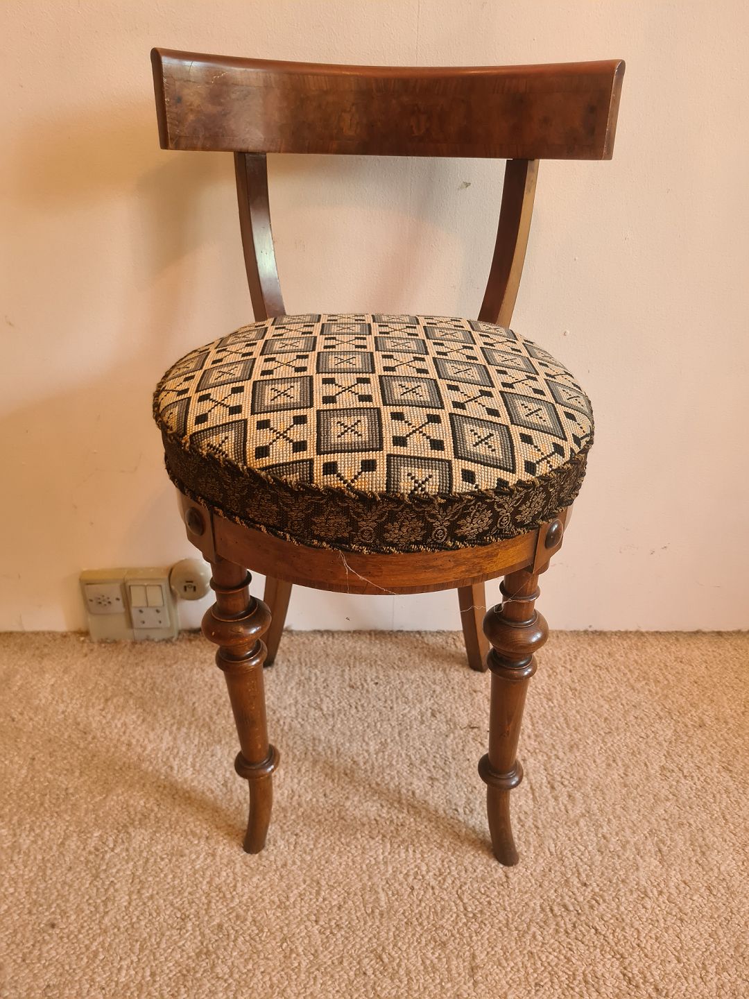 Pianostol fra 1930'erne I mahogni og fyr med broderet sæde. Fremstår pæn og velholdt uden nævneværdige brugsspor.