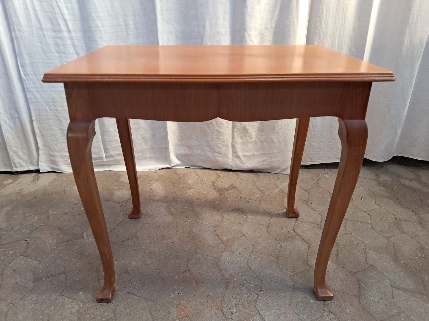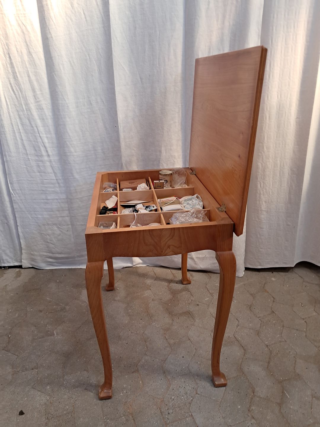 Sybord i fineret elmetræ, fra 1940erne. Det har brugsspor. Højde 72cm Bredde 78cm Dybde 54cm Emne nummer: 91804