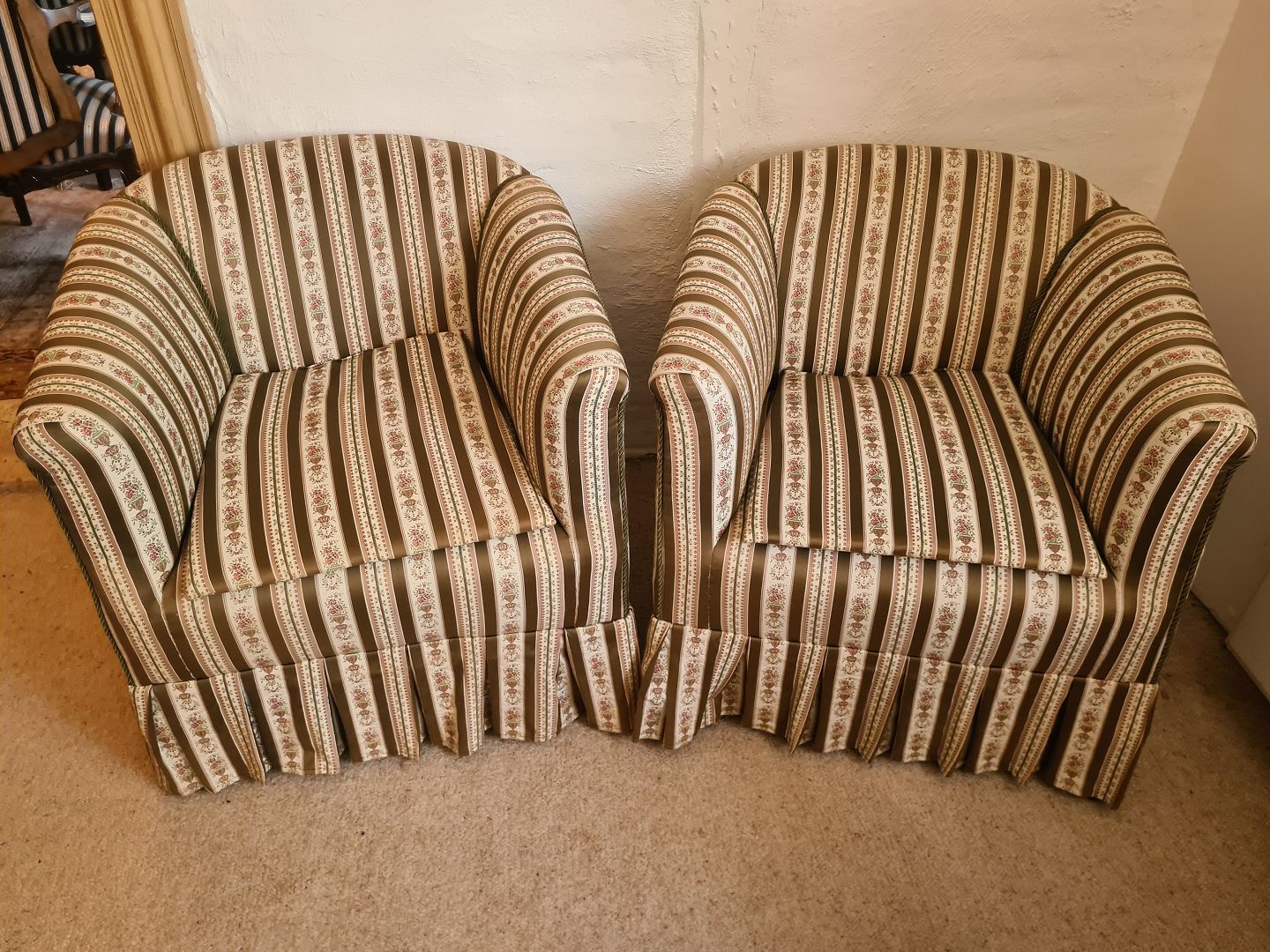 Par overpolstrede lænestole fra 1950'erne. Fremstår pæne og velholdte uden nævneværdige brugsspor. Højde 70 cm. Bredde 70 cm. Dybde 68 cm. Sædehøjde 42 cm. Emne nummer: 80901