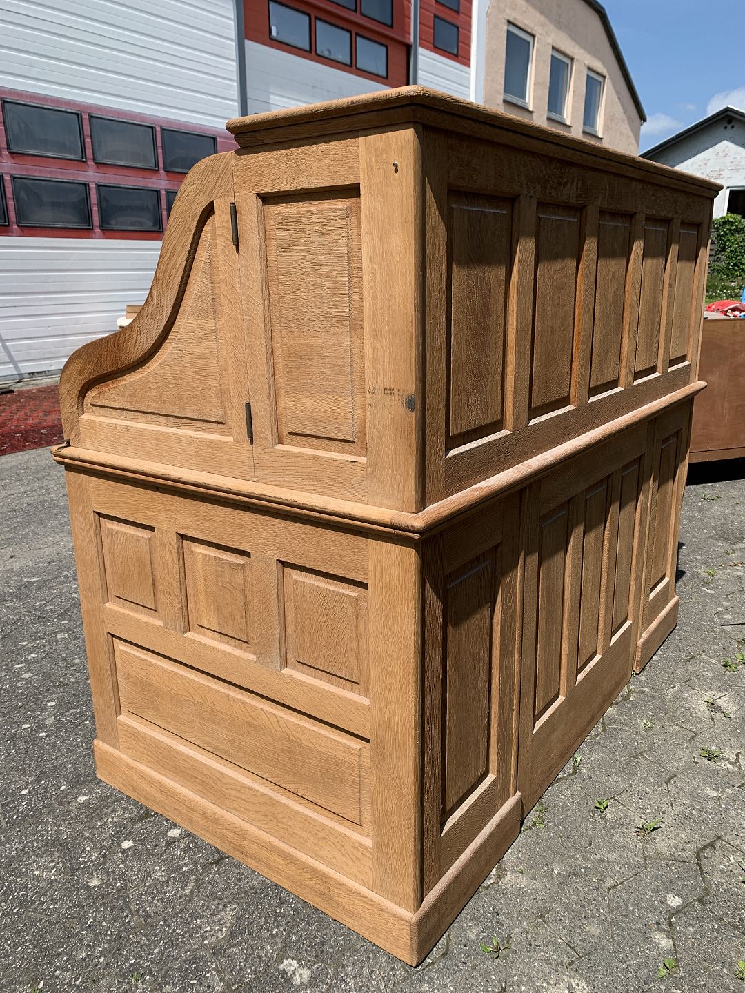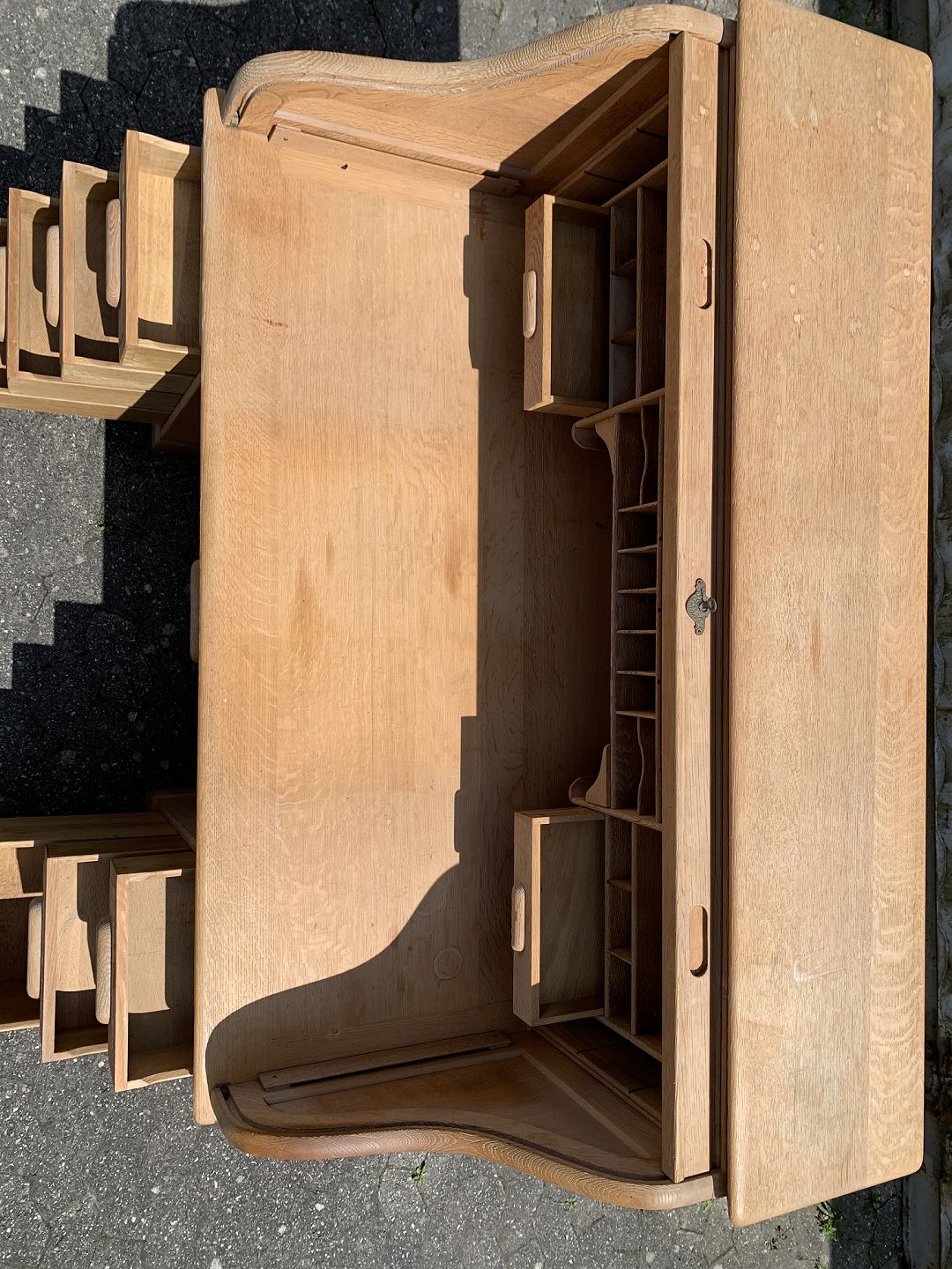 Amrikansk skrivebord i massivt egetræ, fra 1920erne. Det har patina. Højde 130cm Bordpladehøjde 77cm Højde fra gulv til underkant 62cm Bredde 150cm Dybde 80cm Emne nummer: 76878