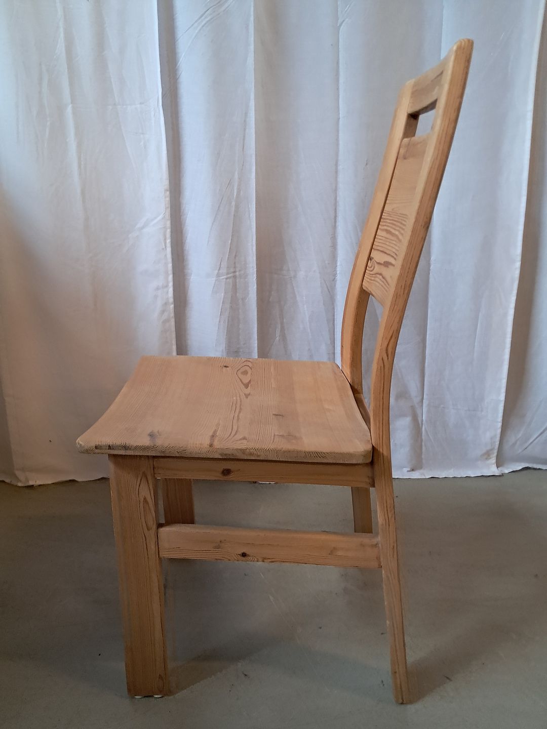 Stol i massivt fyrretræ, fra 1980erne. Den har brugsspor og er lidt ledløs. Ryghøjde 98cm Sædehøjde 44cm Emne nummer: 76883