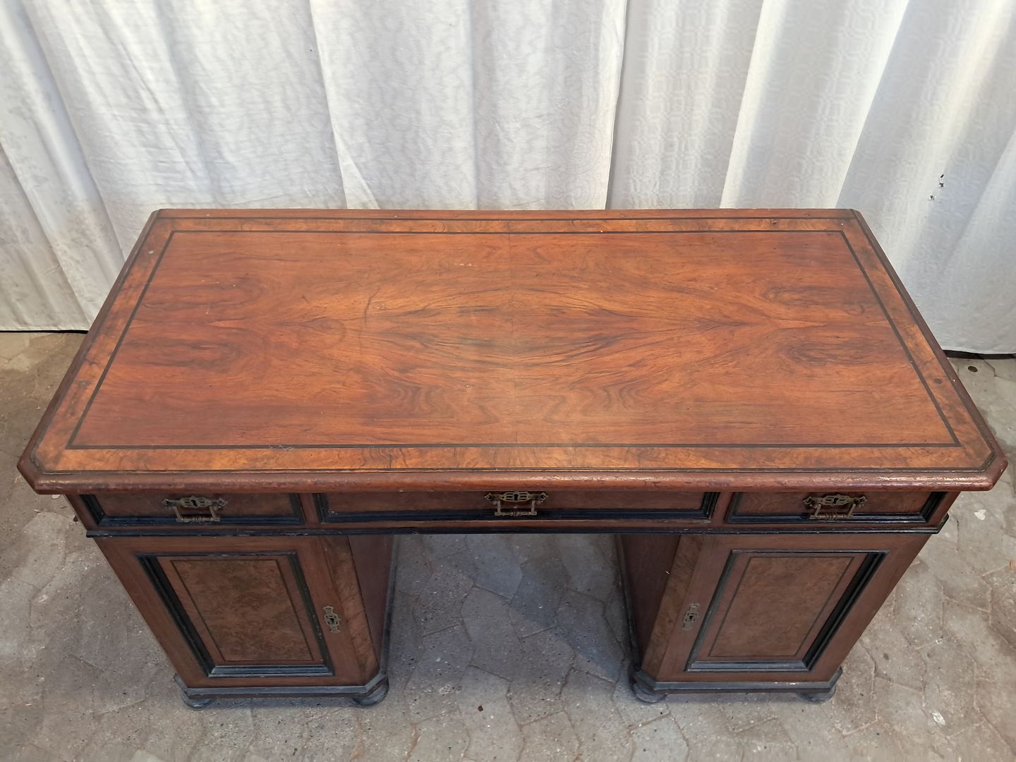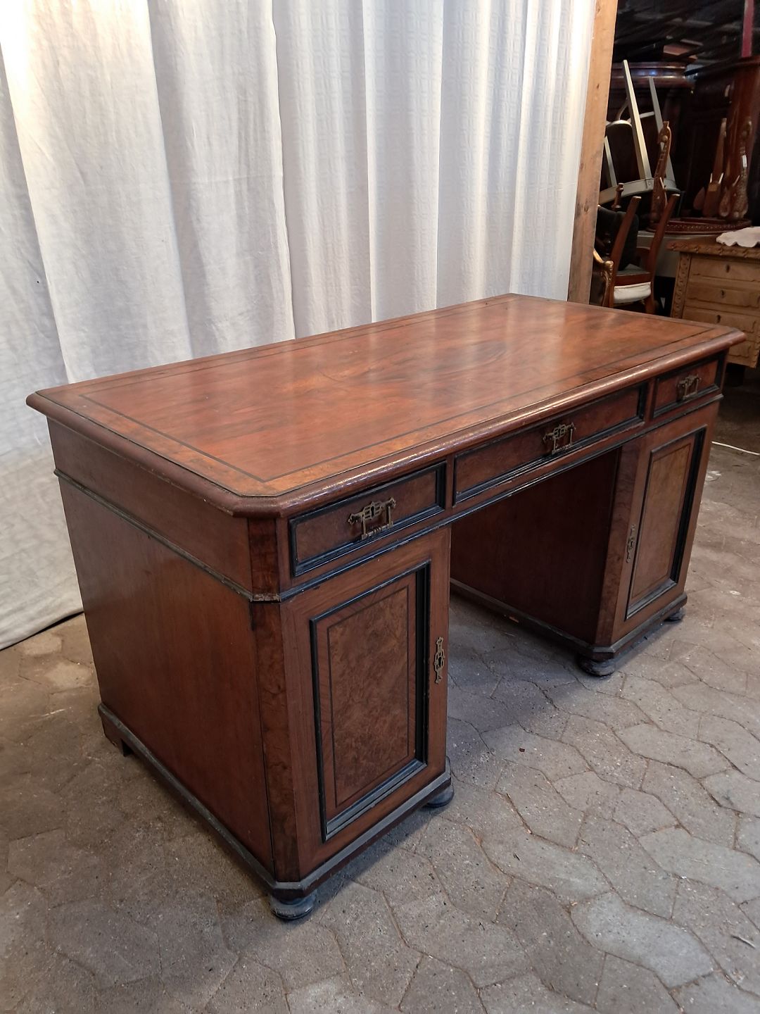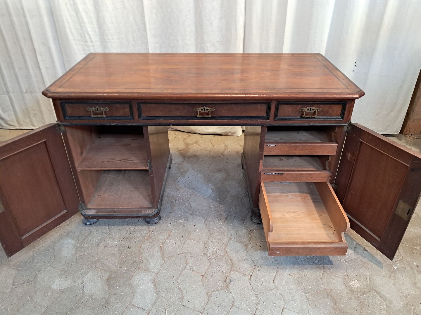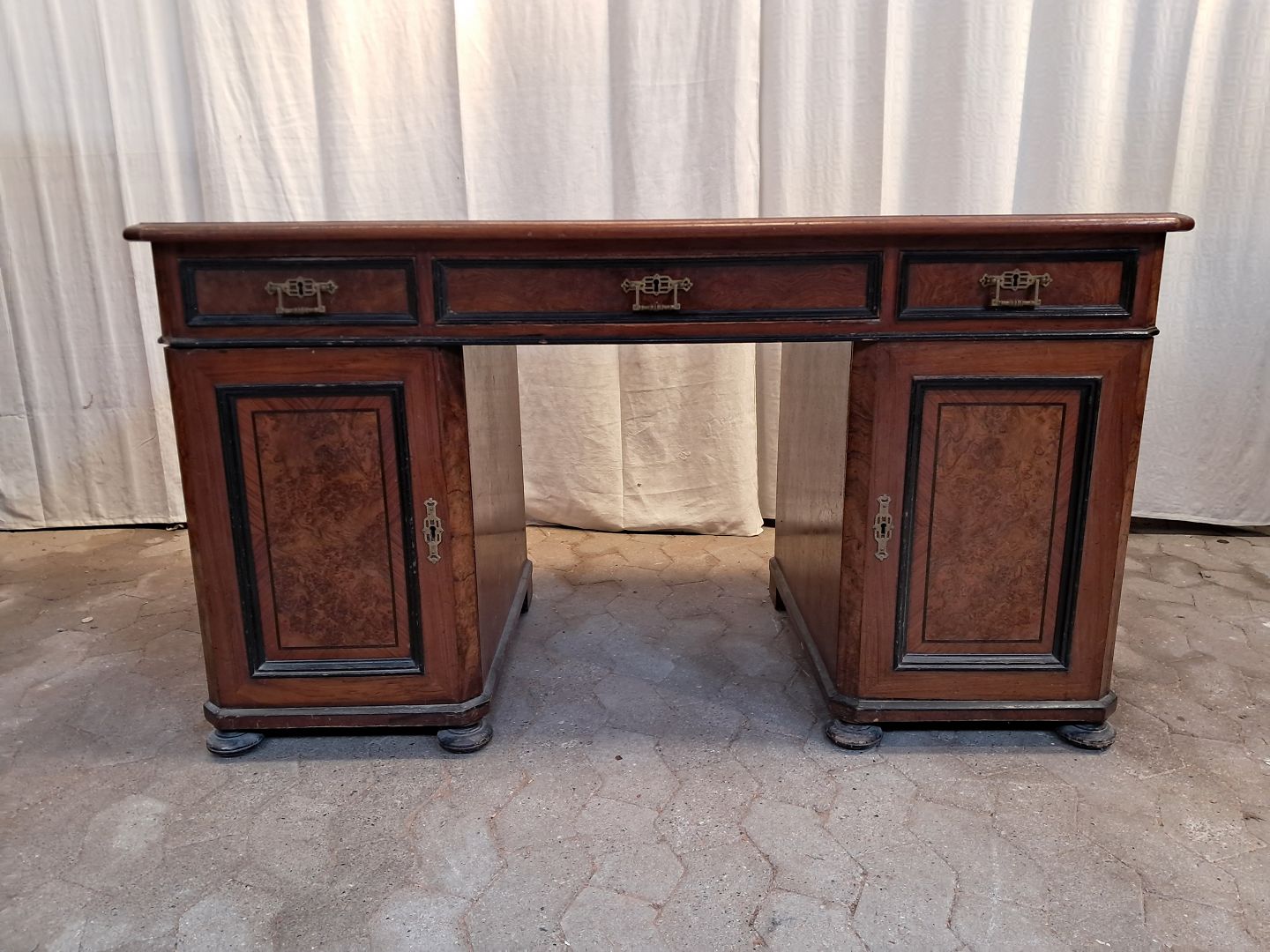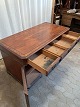 Skrivebord i fineret mahogni og rodtræ, fra 1900erne. Det har brugsspor og mangler en hjørneliste. (se foto) Højde 77cm Bredde 142cm Dybde 68cm Højde fra gulv til underkant 61cm Emne nummer: 91839