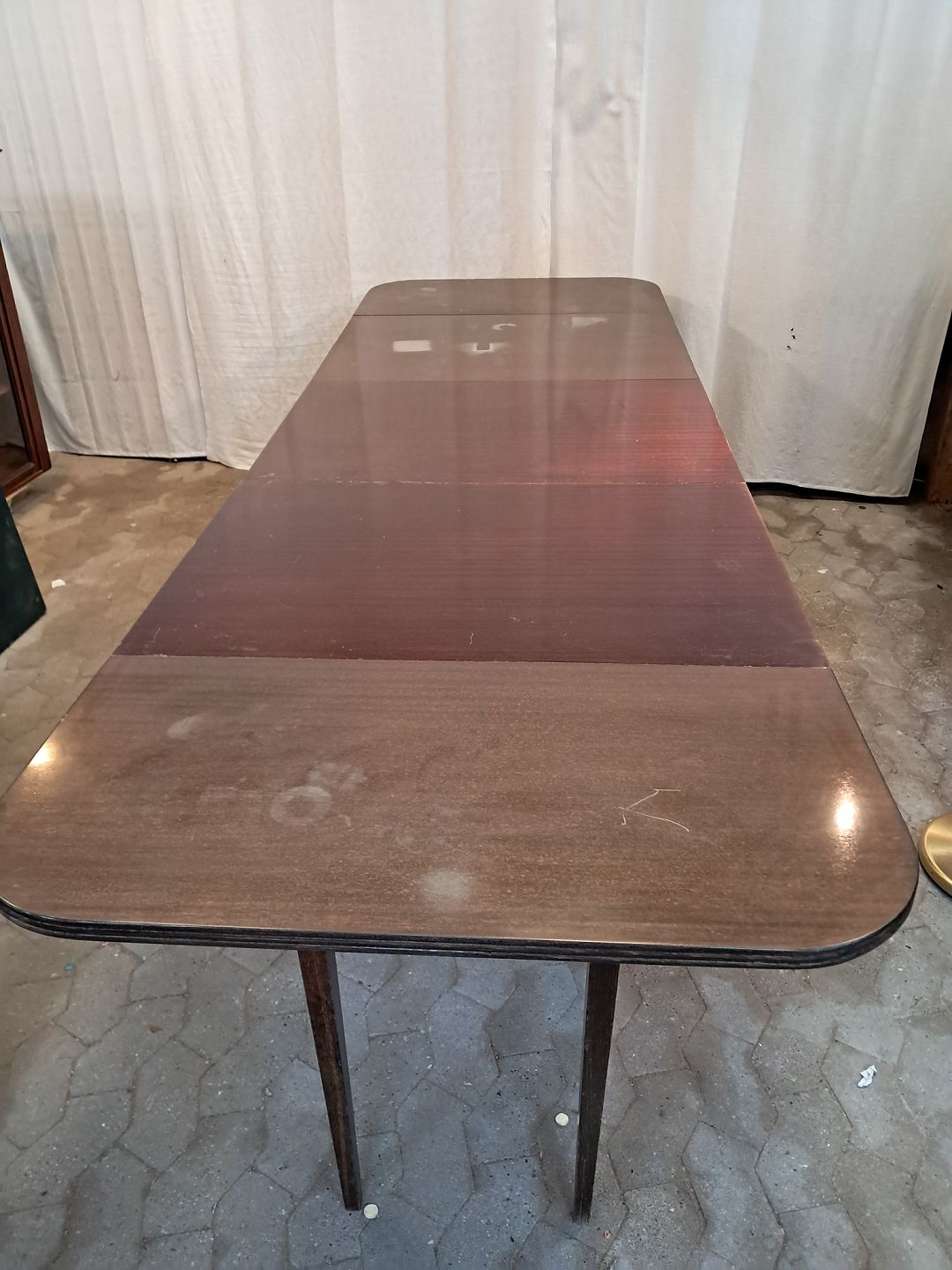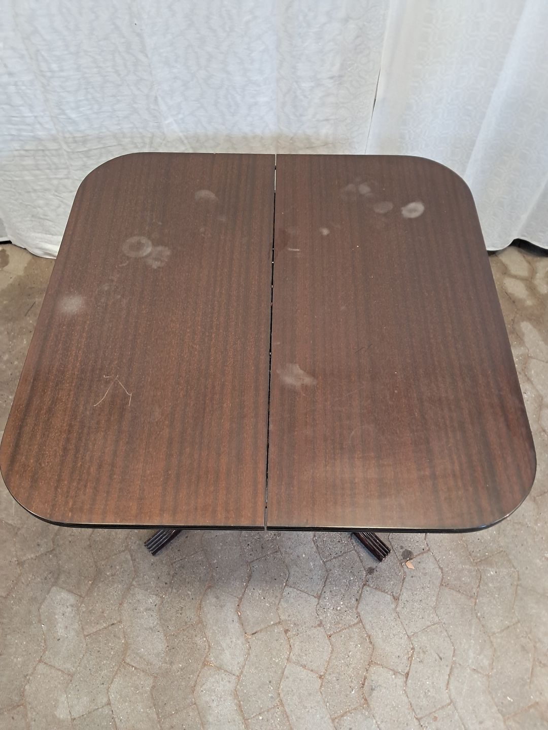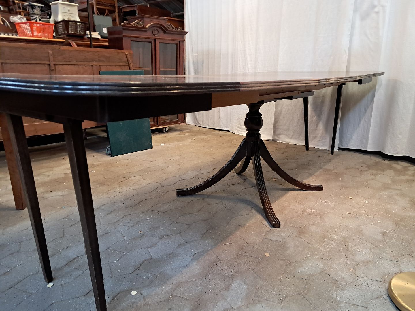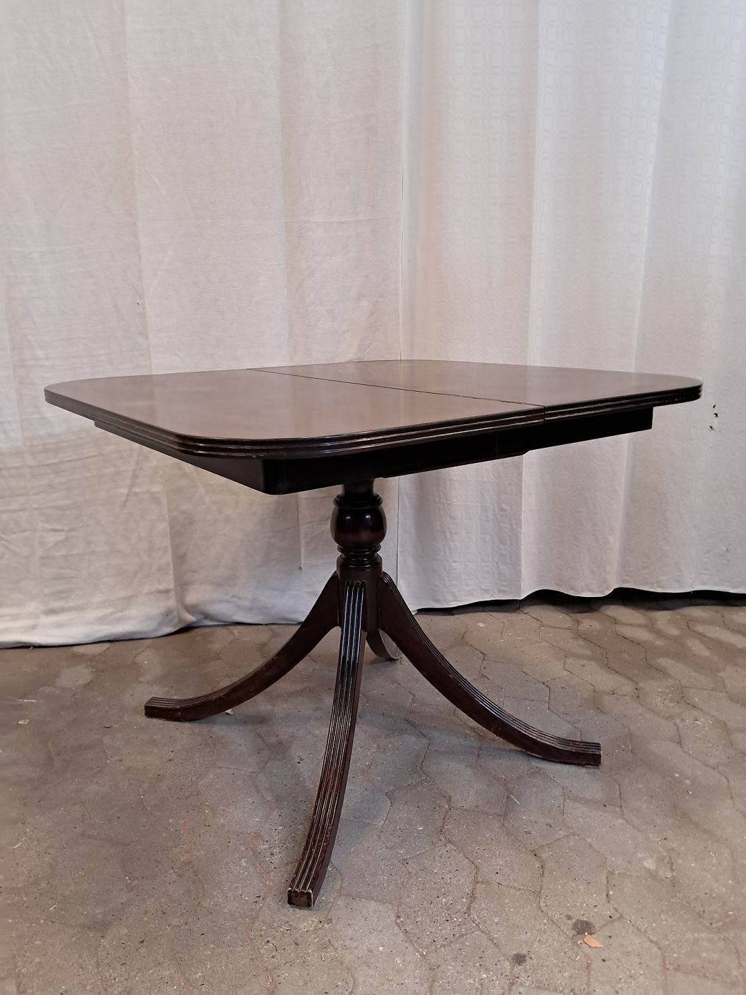 Spisebord i fineret mahogni med 3 tillægsplader. Det har brugsspor og er falmet i farven. Højde 74cm Bredde 95cm Længde 97cm Længde med tillægsplader 292cm Emne nummer: 91858