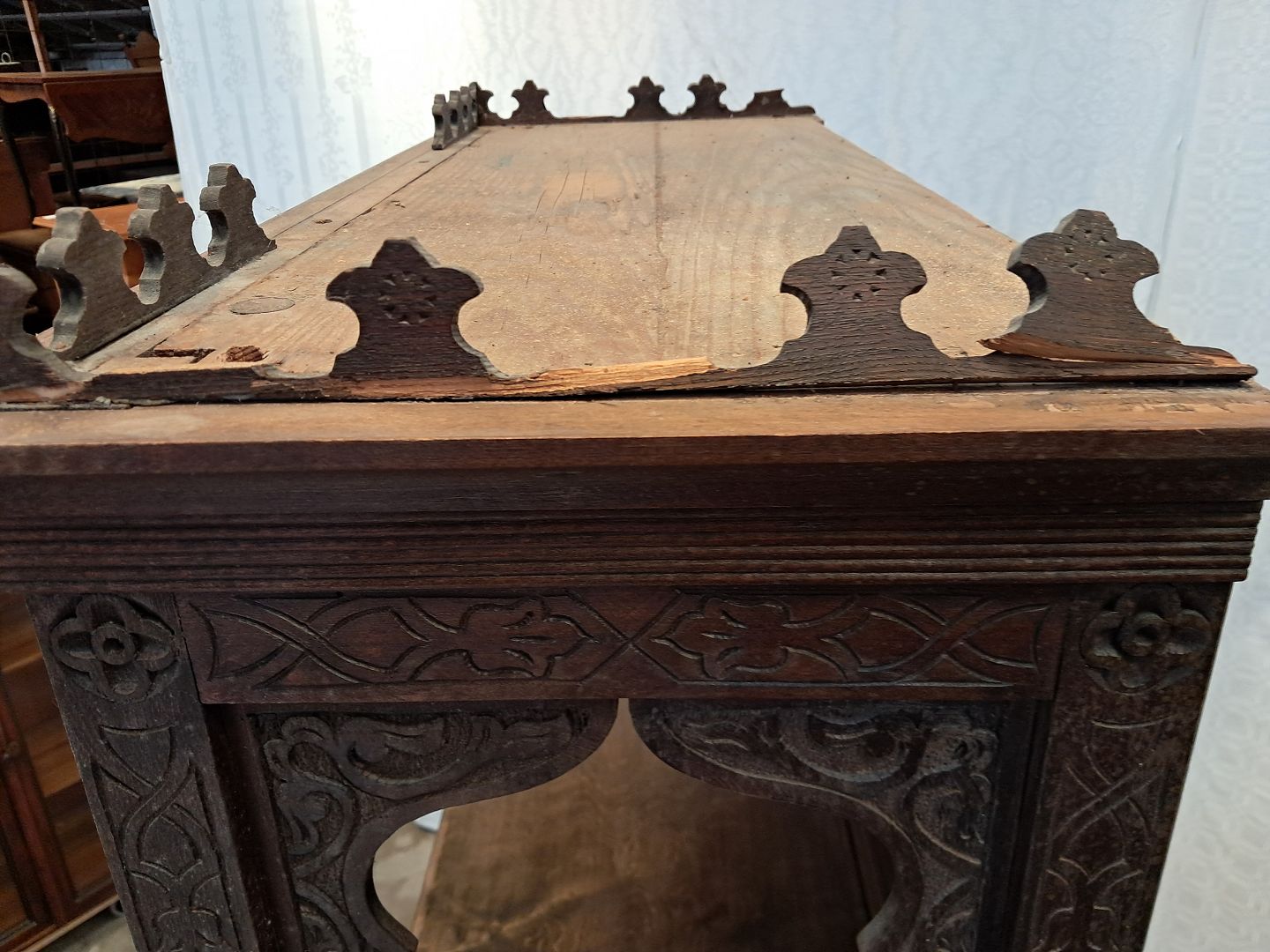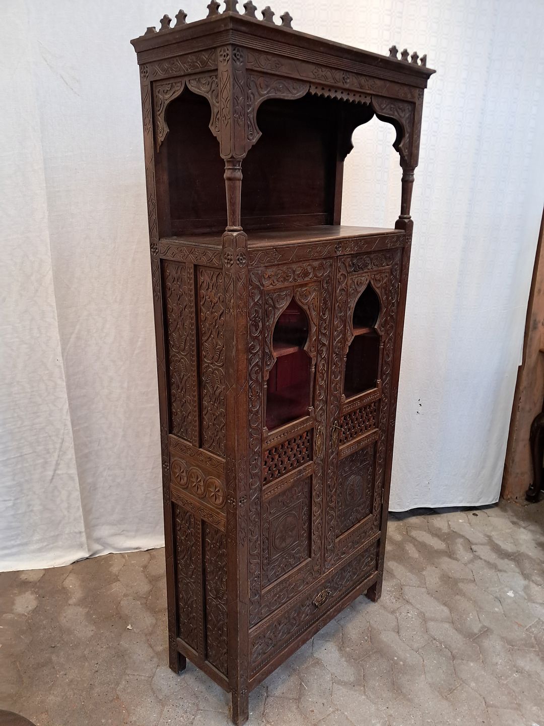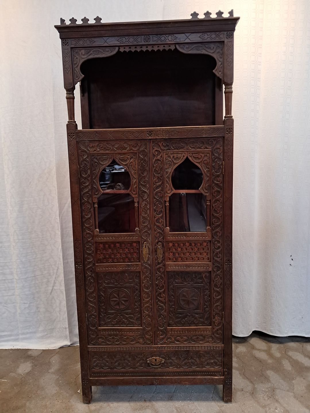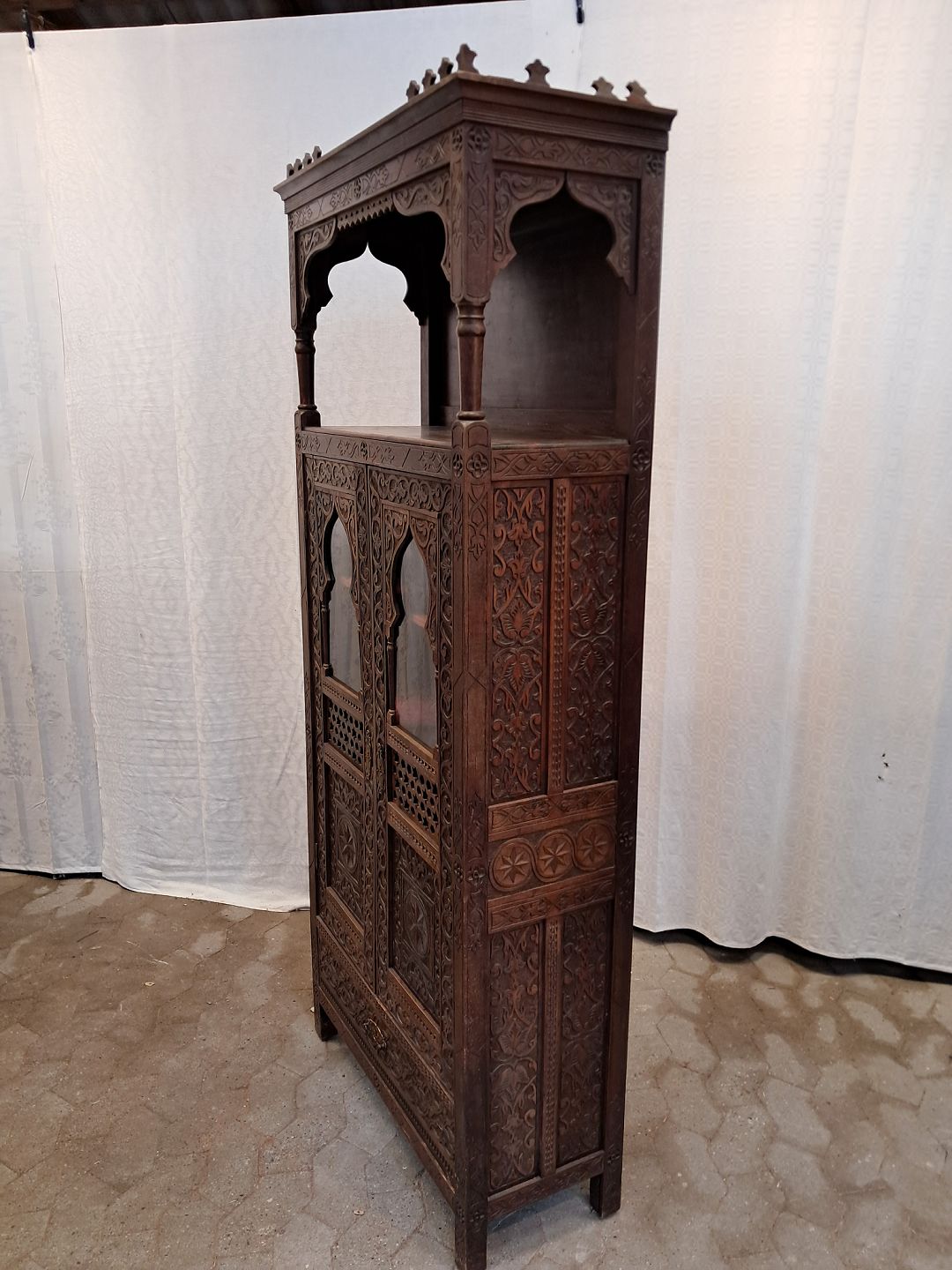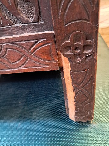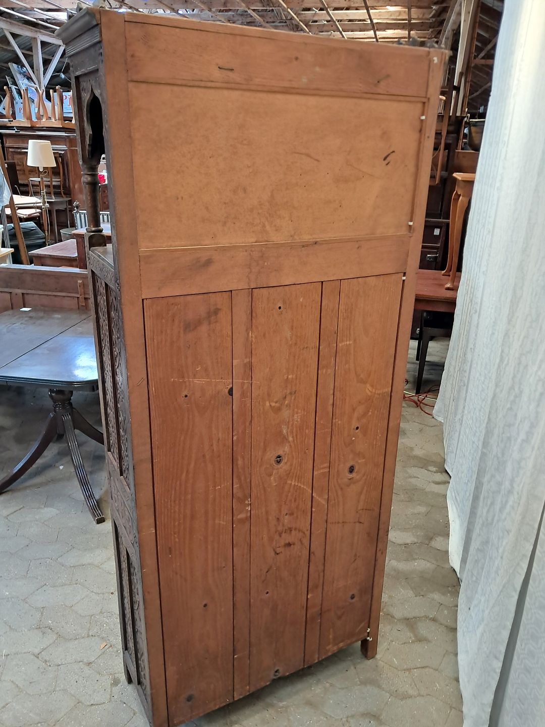 Skab i massivt egetræ, fra 1930erne. Det har brugsspor og defekter på toppen og venstre forben. Højde 190cm Bredde 82cm Dybde 34cm Emne nummer: 91859