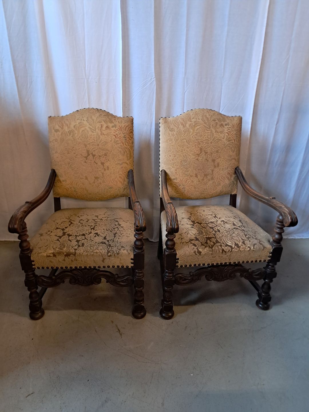 2 Armstole i massivt egetræ, fra 1920erne. De har brugsspor. Ryghøjde 107cm Sædehøjde 45cm Emne nummer: 76967