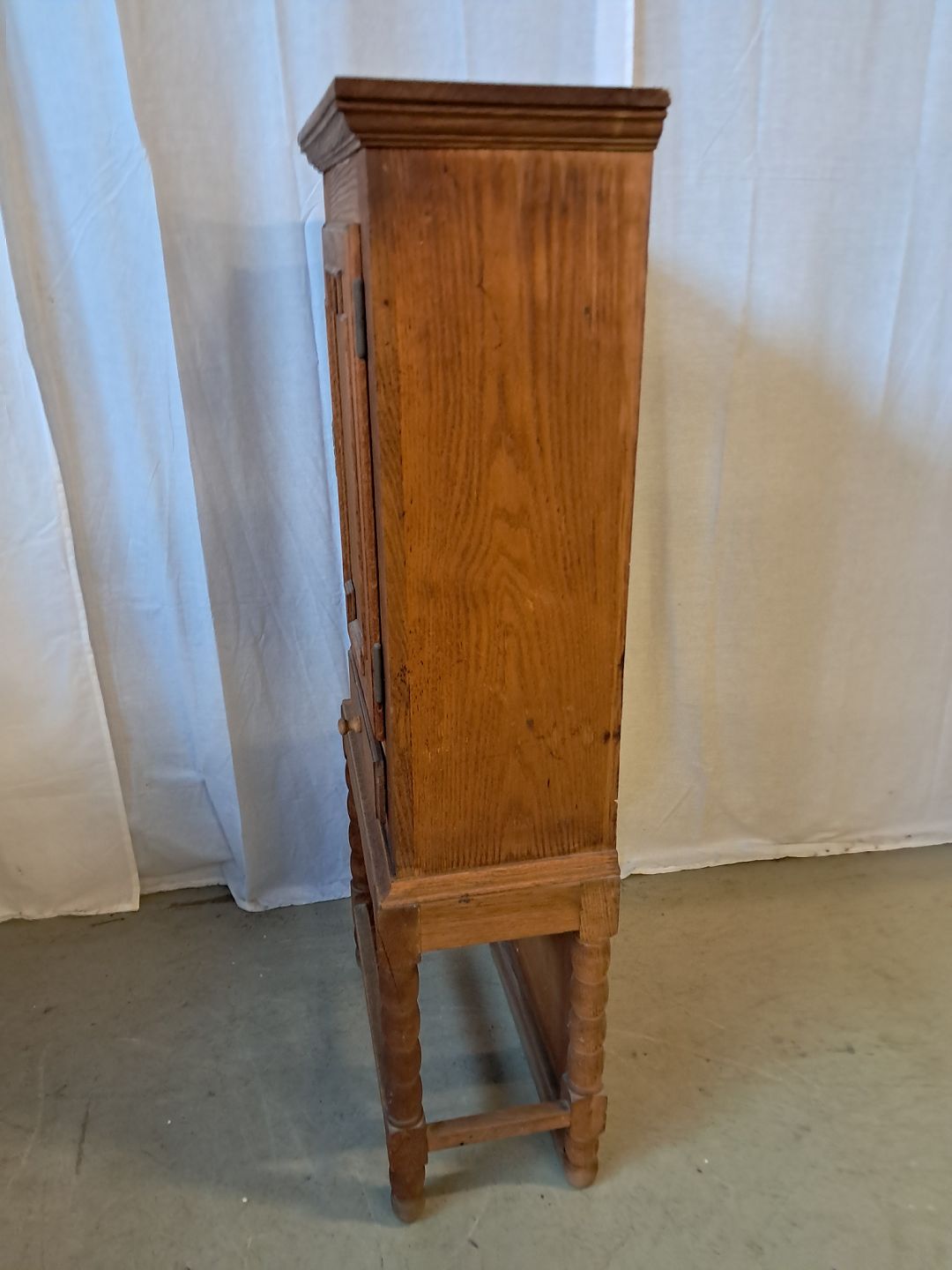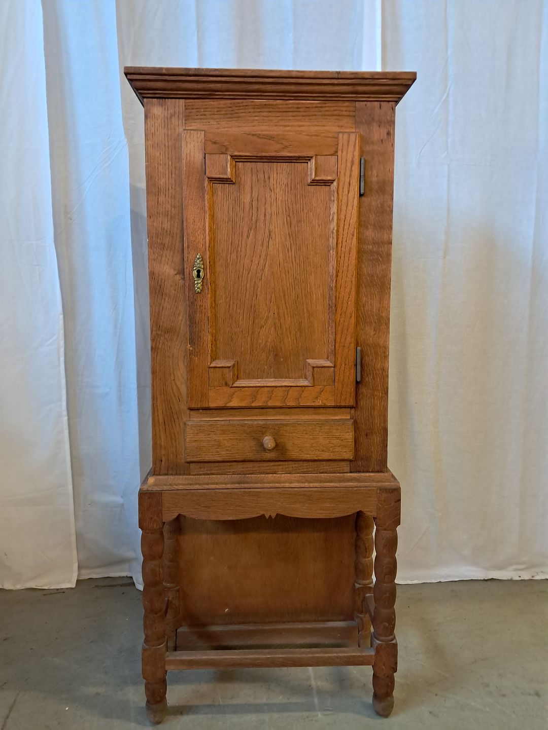 Skab i massivt egetræ, fra 1980erne. Det har brugsspor og mangler låsen. Højde 123cm Bredde 51cm Dybde 26cm Emne nummer: 76990