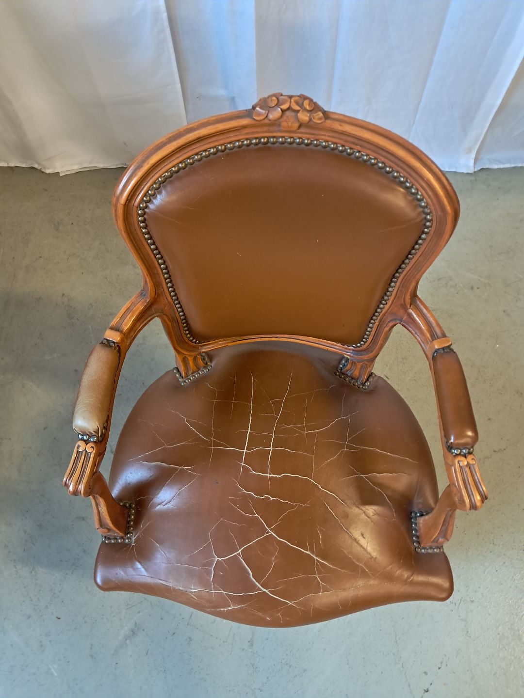 Rokokostol i massivt bøgetræ med kunstlæder, fra 1980erne. Den har brugsspor. Ryghøjde 88cm Sædehøjde 41cm Emne nummer: 76996