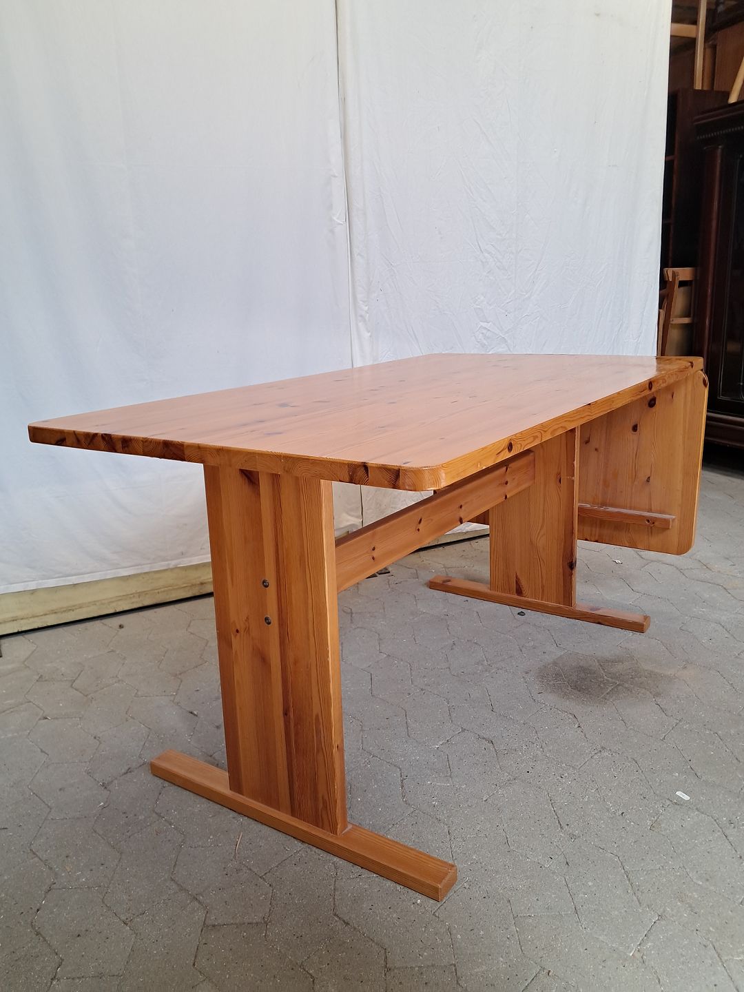 Bord i massivt fyrretræ, fra 1990erne. Det har brugsspor. Højde 71cm Bredde 79cm Længde 140cm Længde med klap 190cm Emne nummer: 91887
