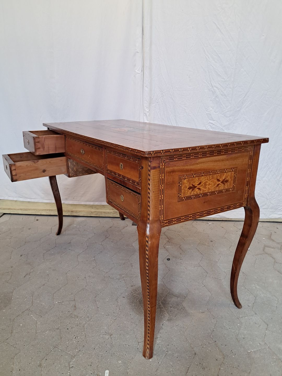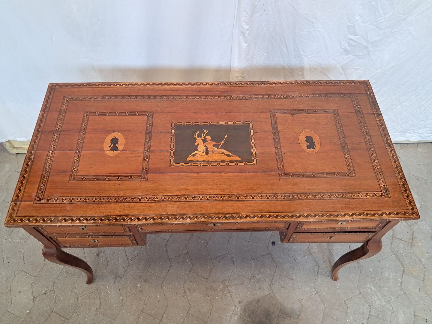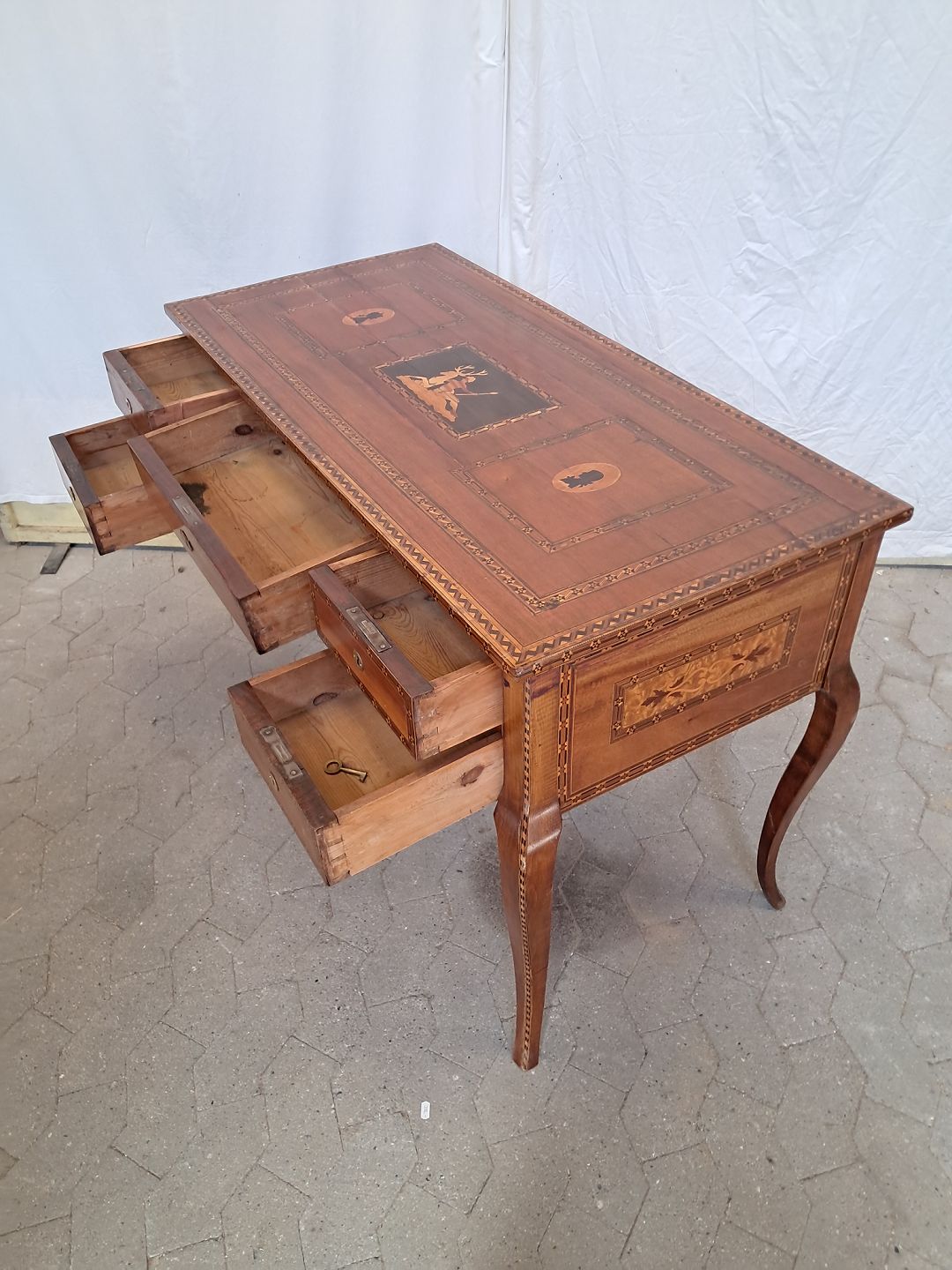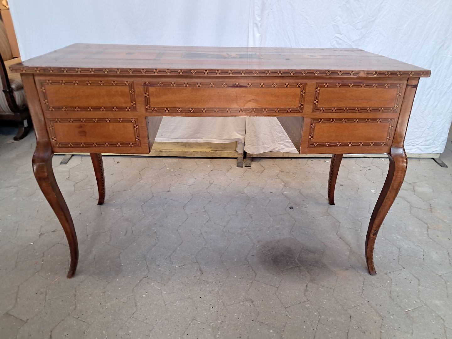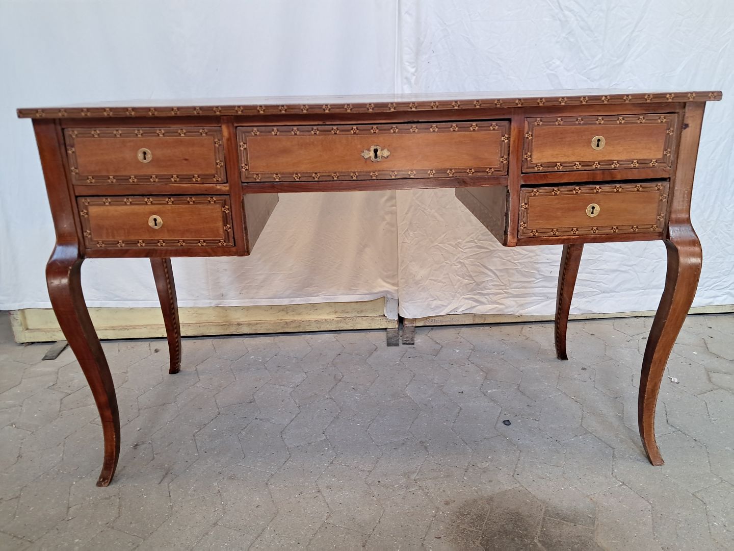 Skrivebord i fineret mahogni og nødetræ, fra 1930erne. Det har brugsspor. Højde 77cm Bredde 122cm Dybde 57cm Højde fra gulv til underkant 62cm Emne nummer: 91888