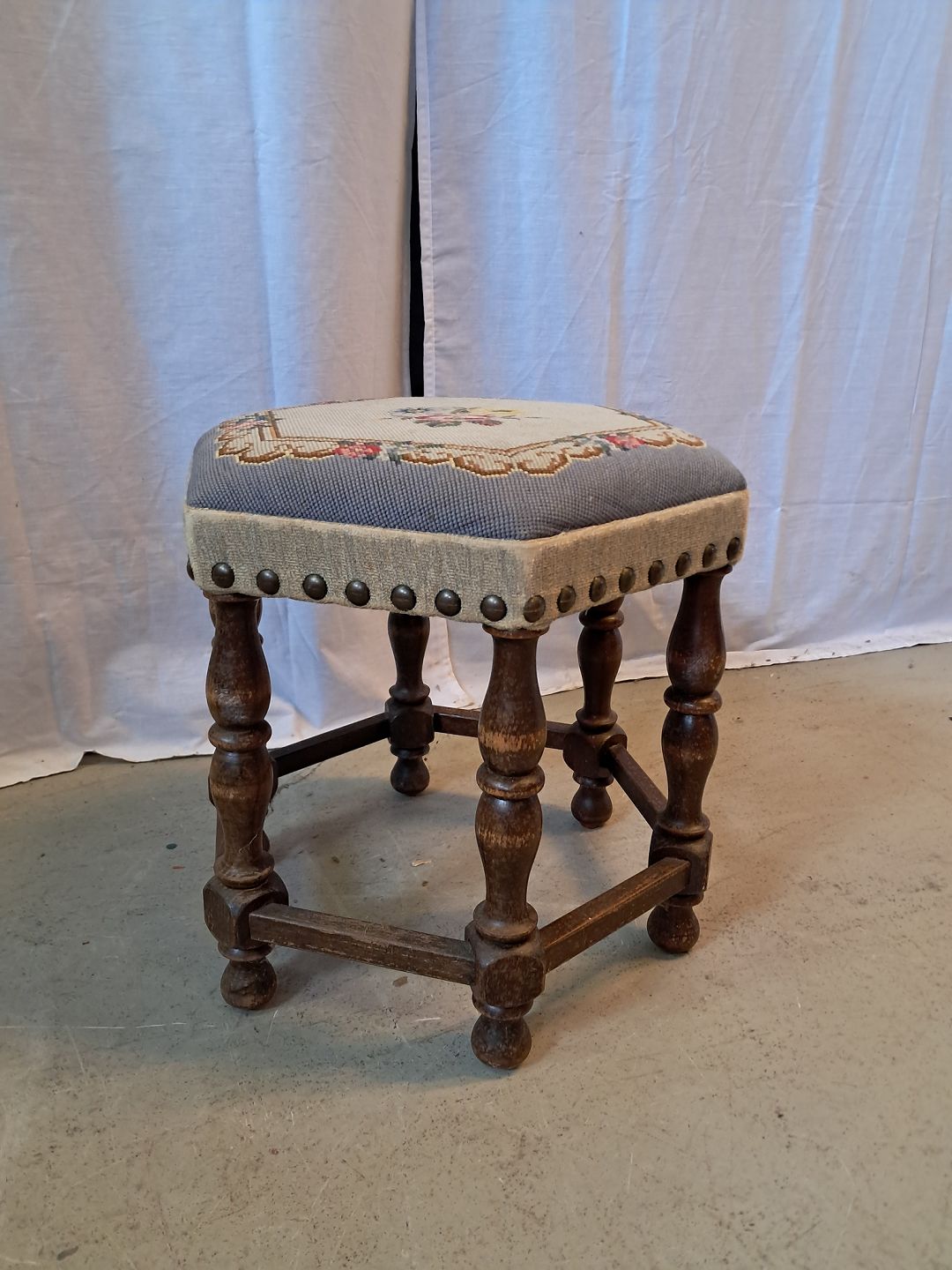 Skammel i bøgetræ med broderet betræk, fra 1950erne.