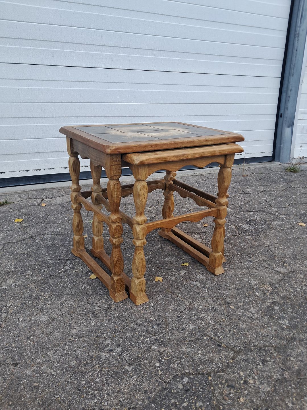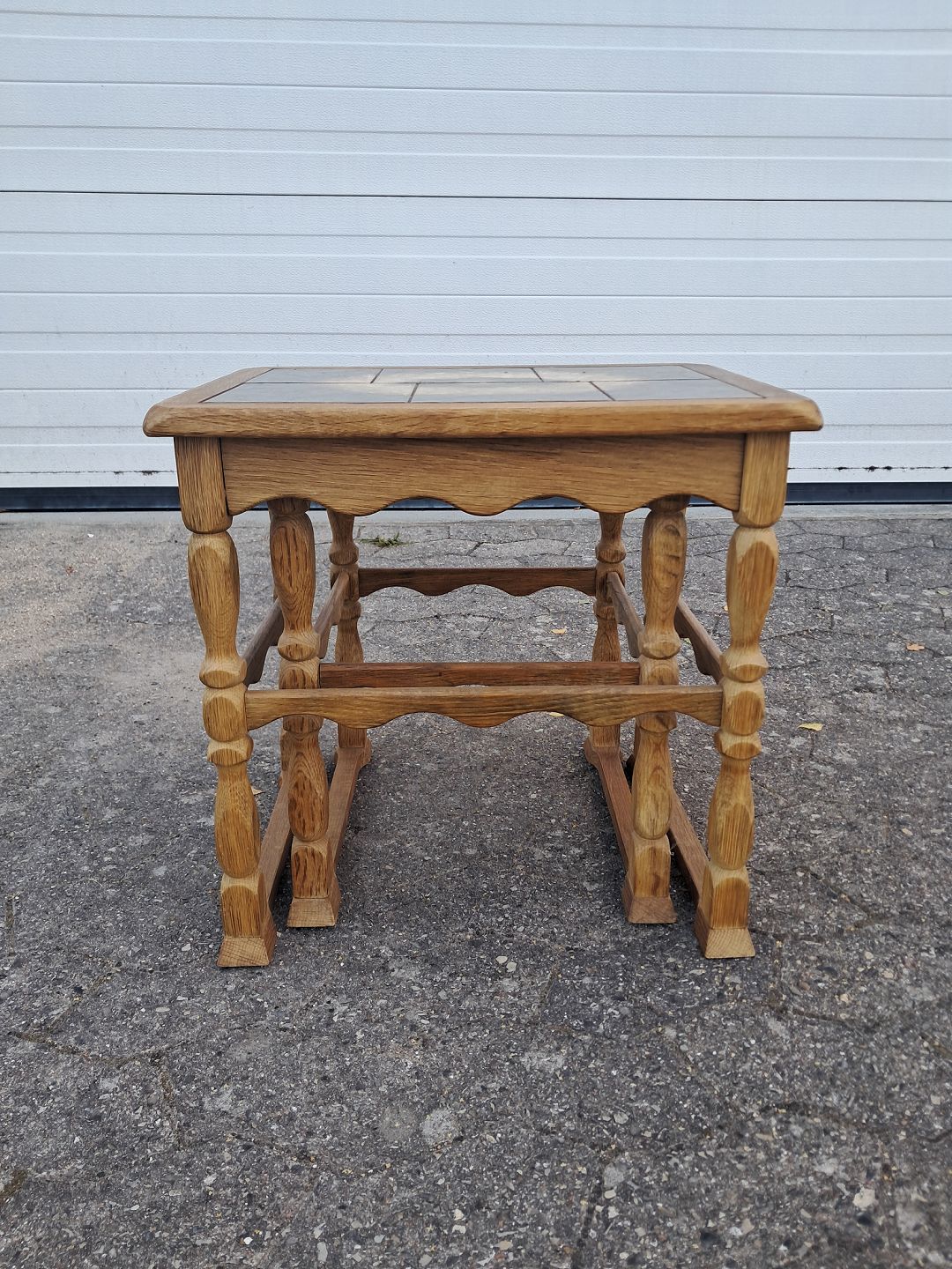 2 Borde i massivt egetræ og kakler, fra 1980erne. De har brugsspor. Højde 42cm Bredde 48cm Dybde 42cm Emne nummer: 77150