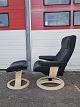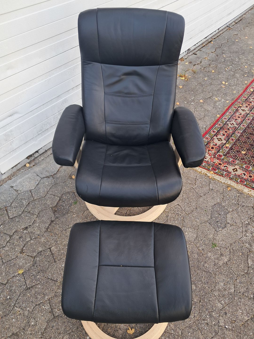 Lænestol og skammel i bøgetræ med læderbetræk, fra 2000erne.