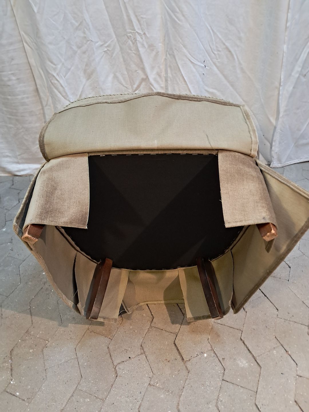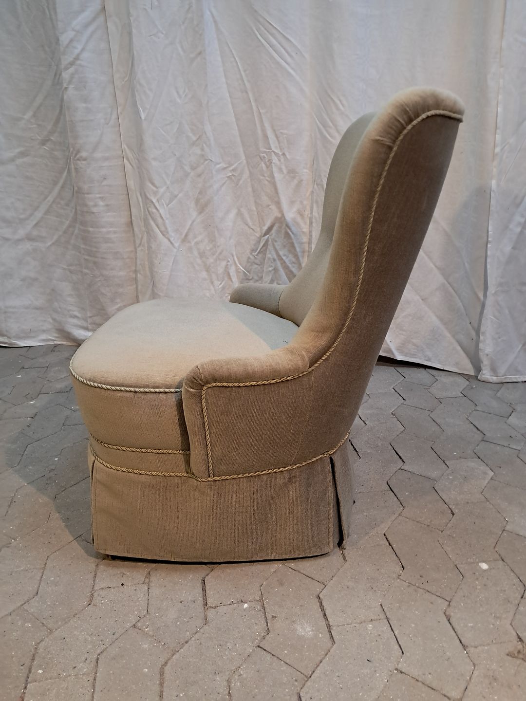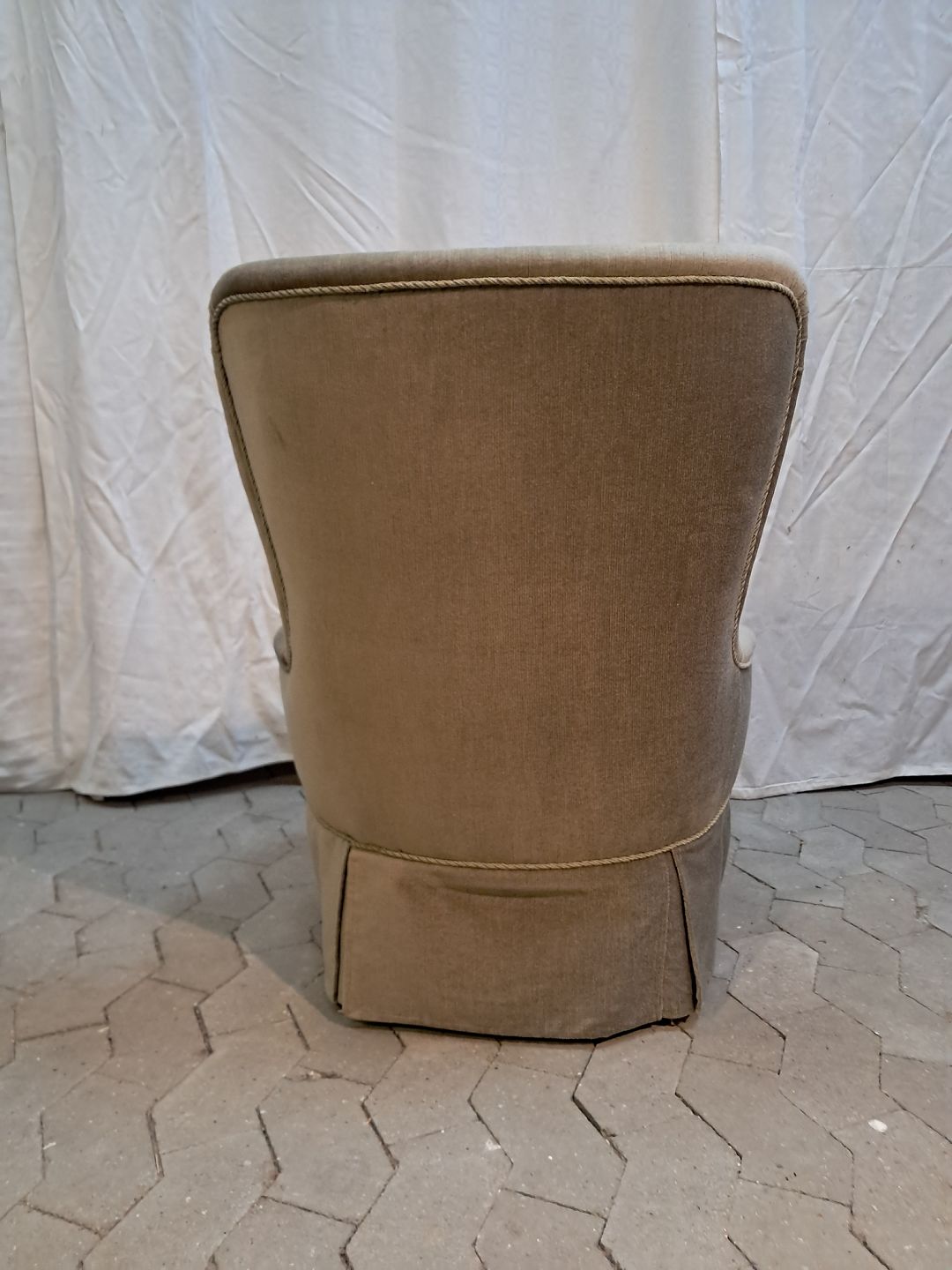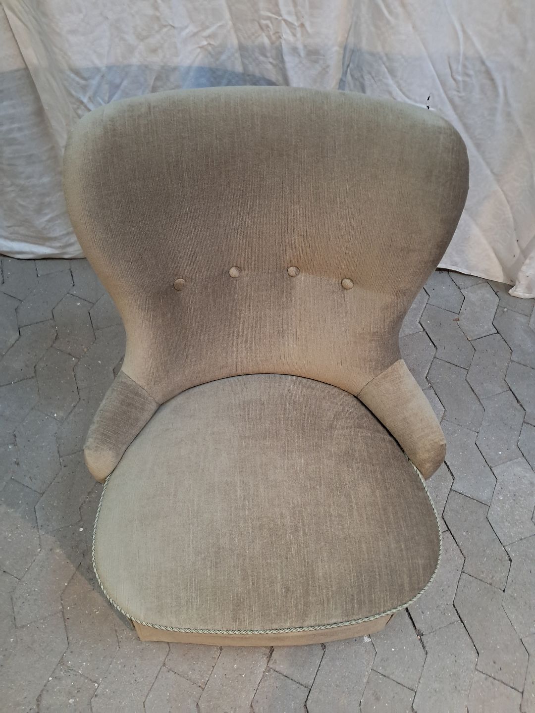 Lænestol i lysegrøn velour, fra 1950erne. Den har brugsspor. Ryghøjde 80cm Sædehøjde 39cm Se emne Nr. 91917 og 91908 Emne nummer: 91907