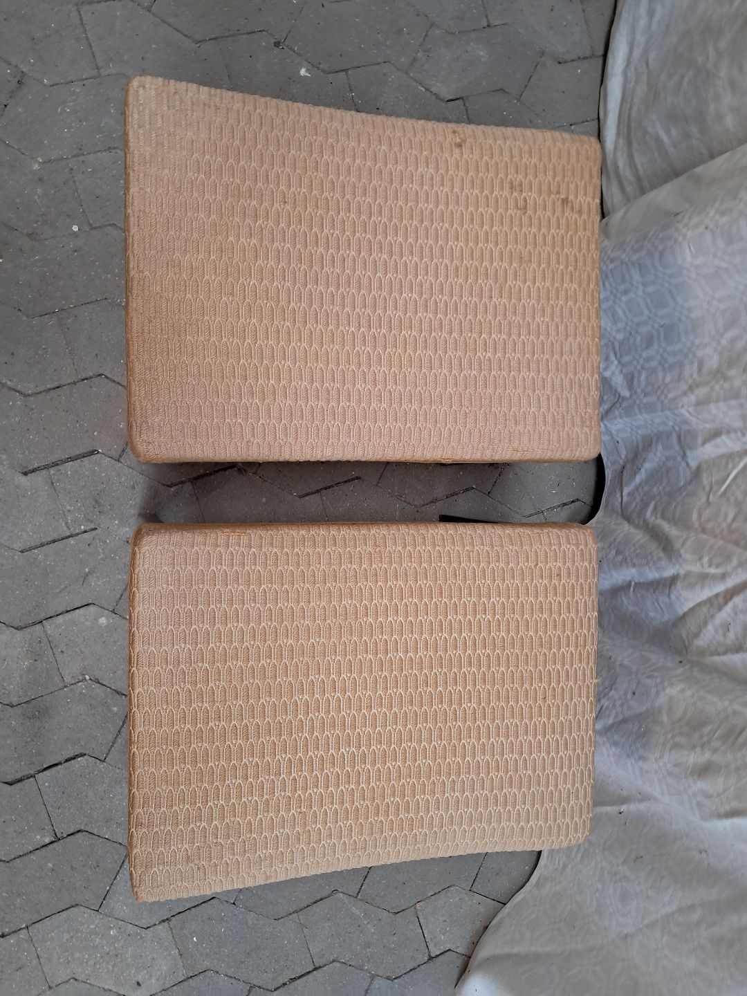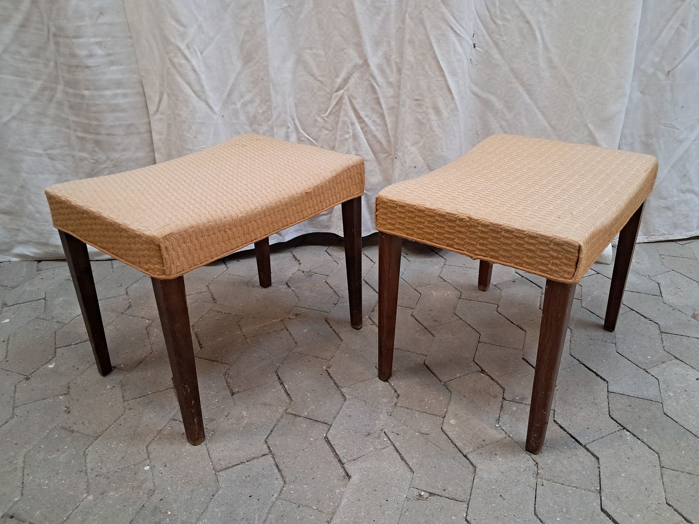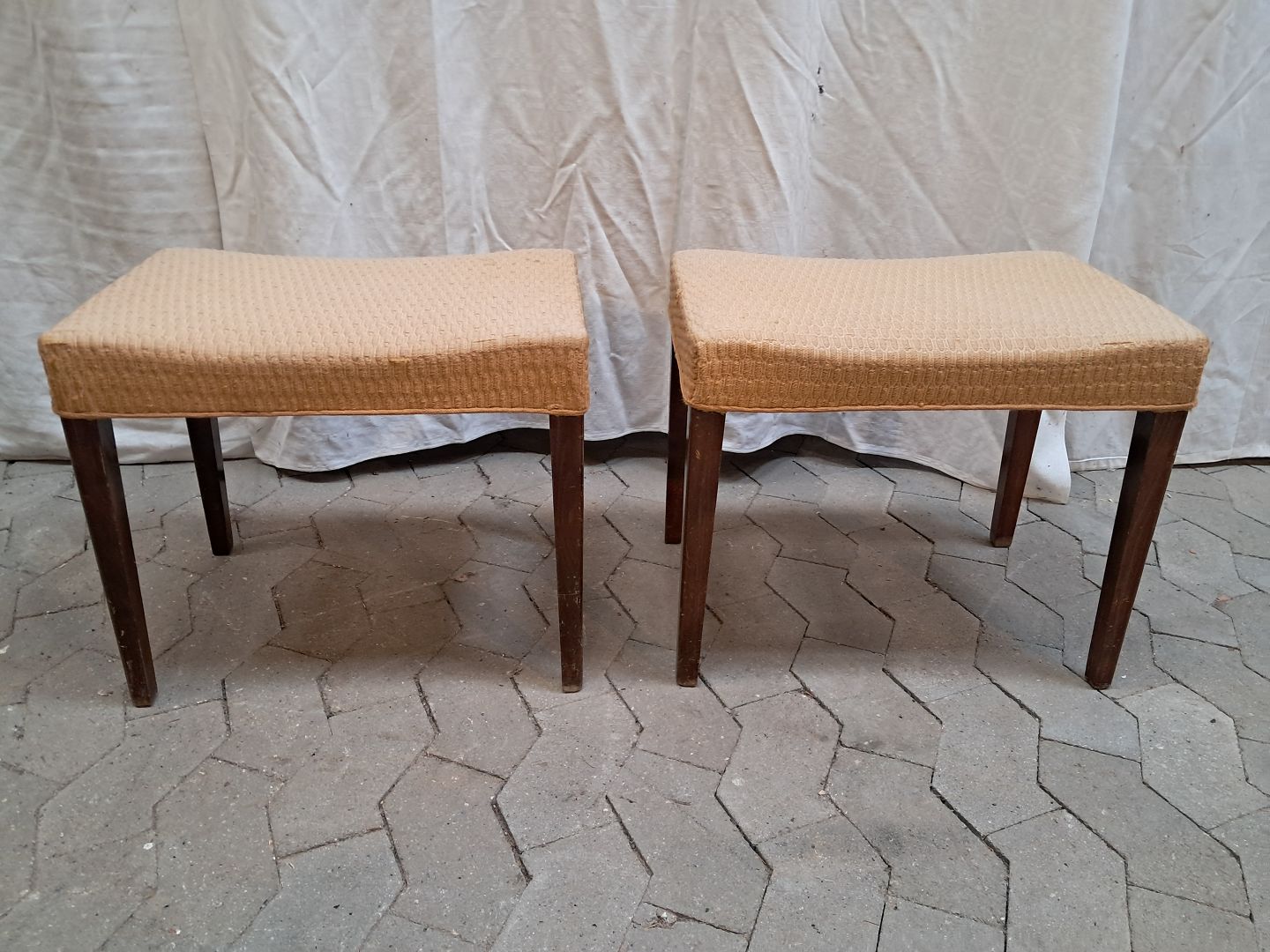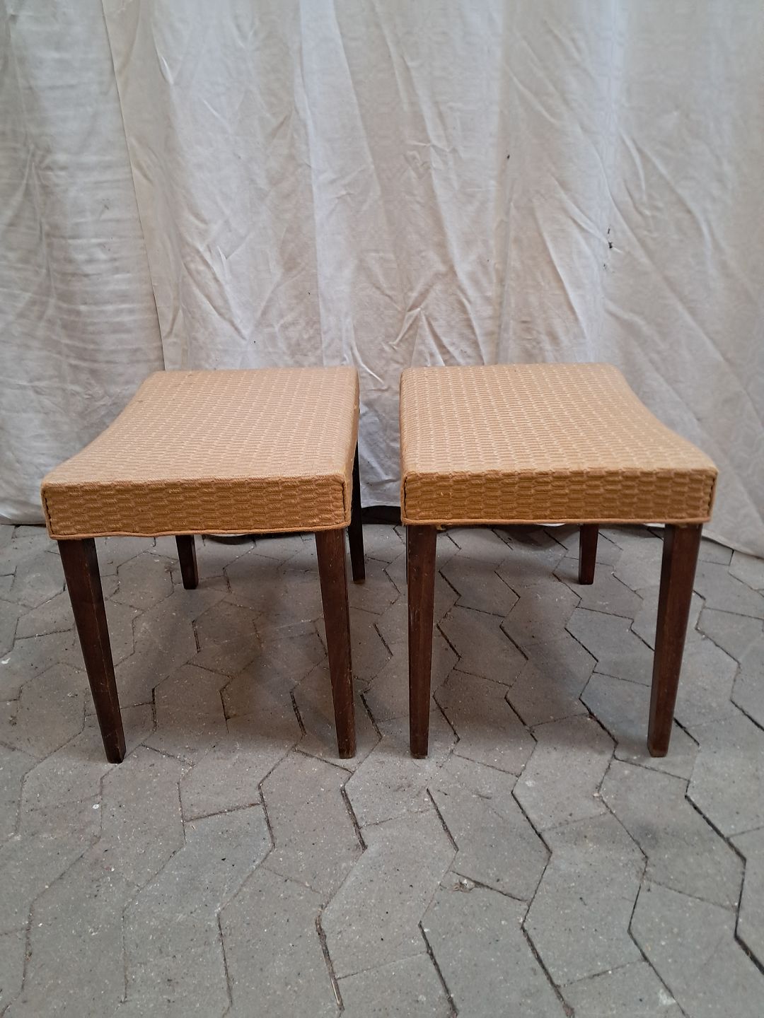 2 Skamler i bøgetræ med stofbetræk, fra 1950erne.