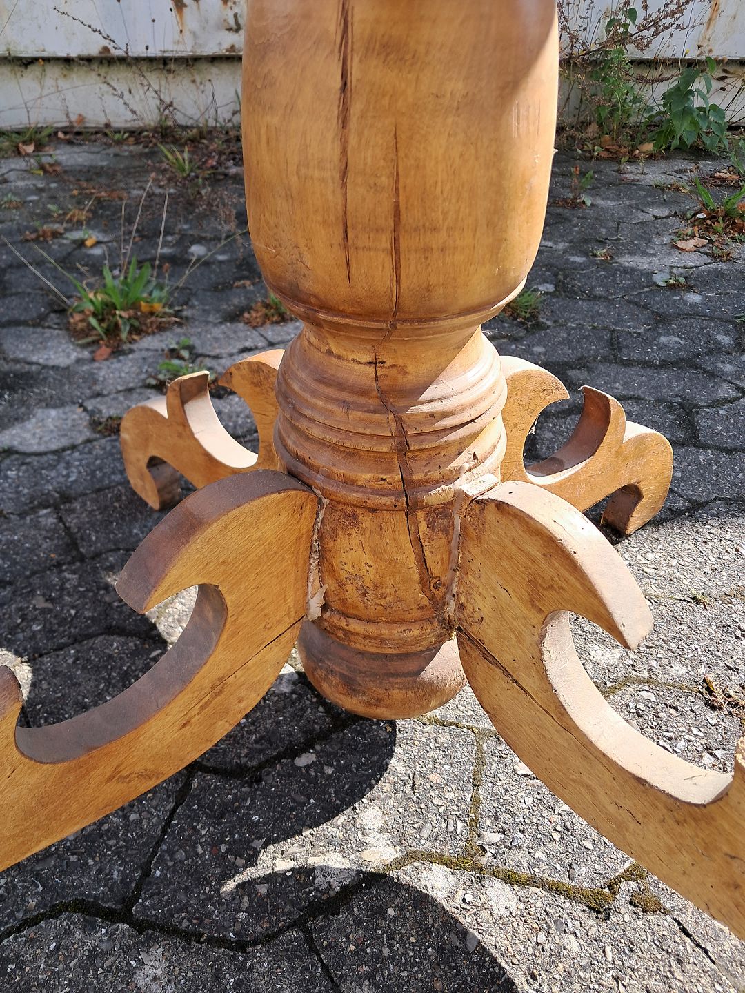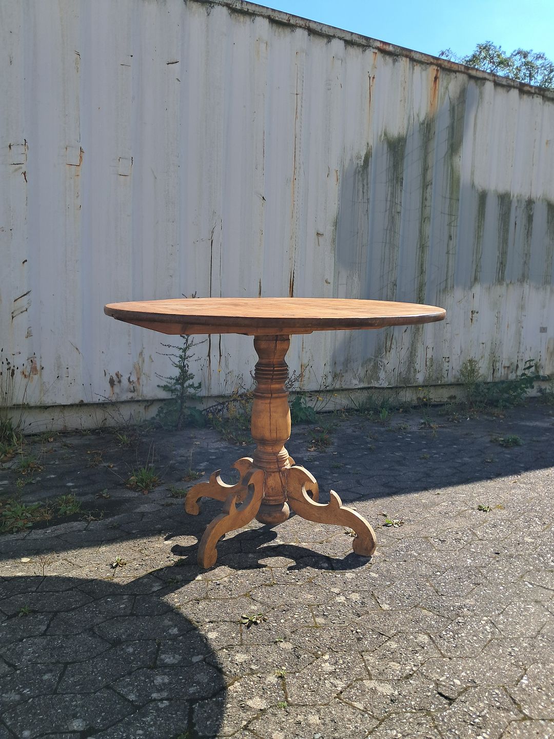 Gammelt bord i massivt bøge og fyrretræ, fra 1900erne. Det har brugsspor og repatationer. Højde 71cm Diameter 104cm Emne nummer: 77175