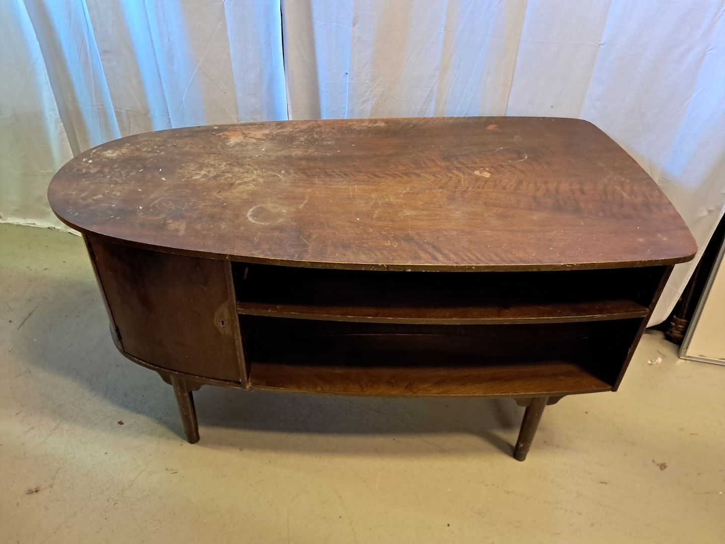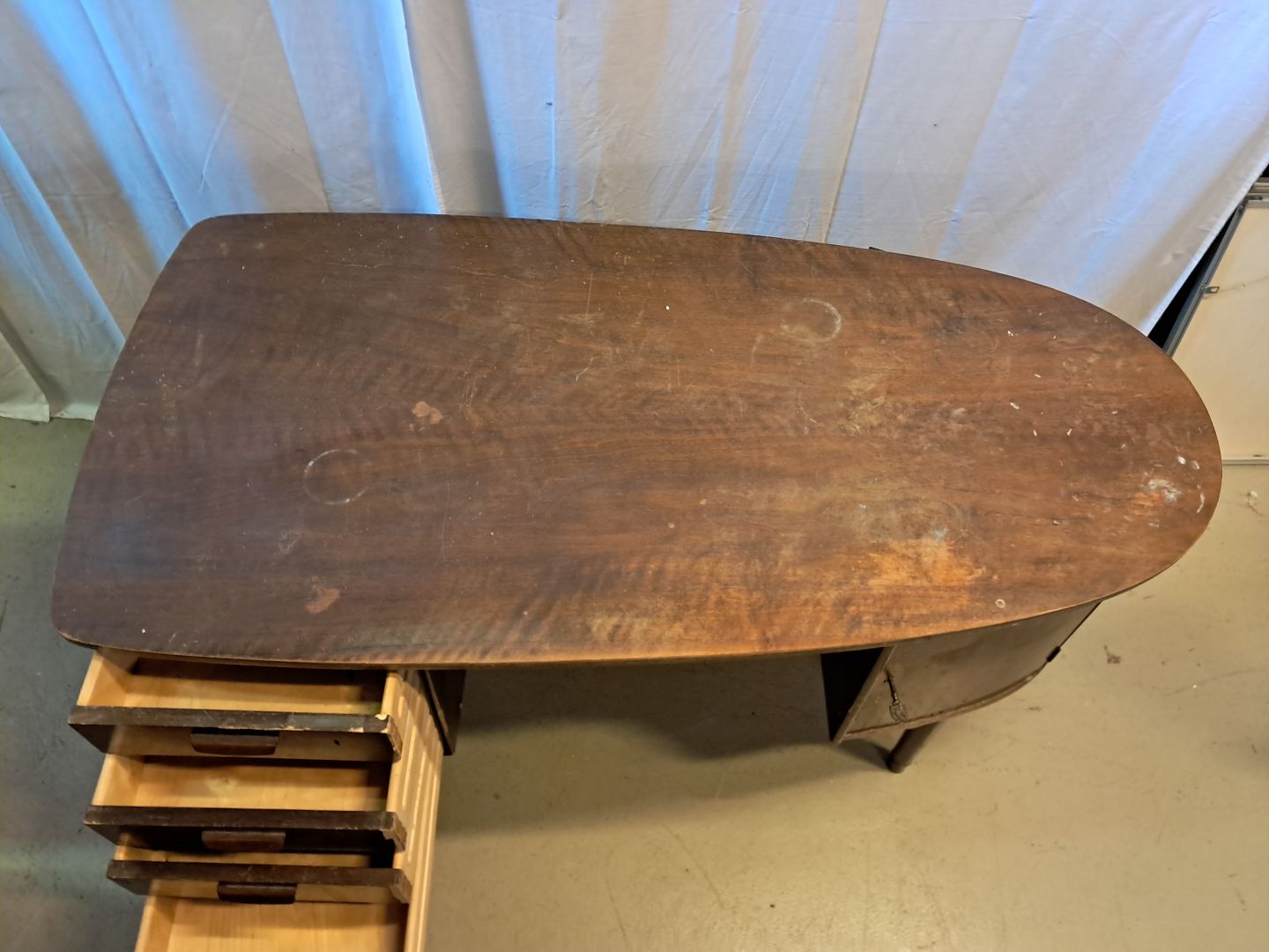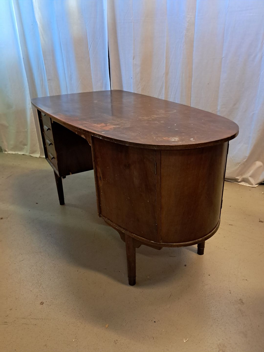 Skrivebord i fineret nødetræ, fra 1960erne. Den har brugsspor. Højde 72cm Bredde 140cm Dybde 66cm Højde fra gulv til underkant 66cm Emne nummer: 77219