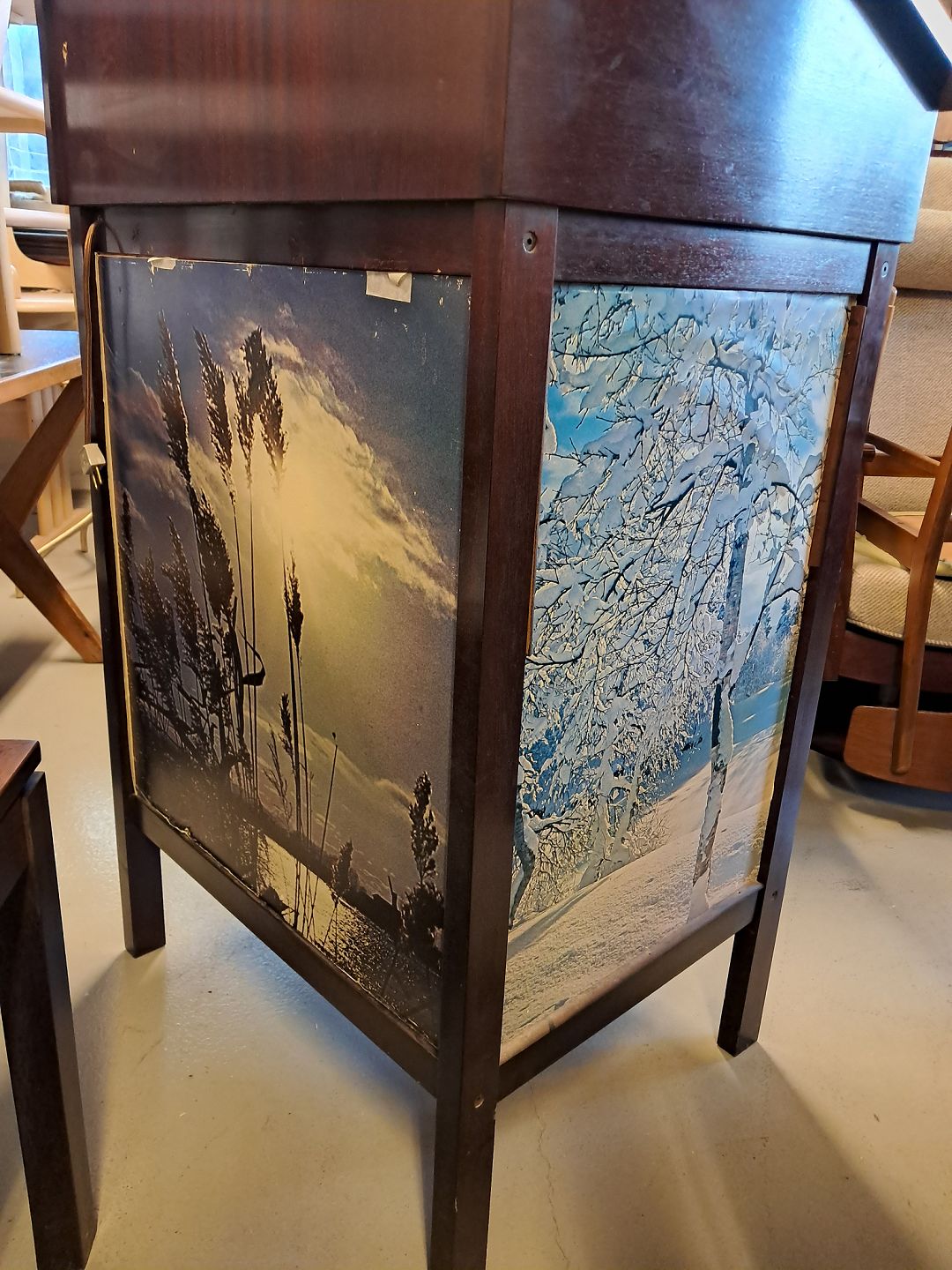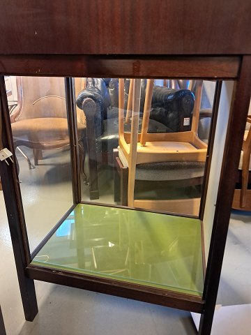 Skrivepult i fineret mahogni og glas, fra 1980erne. Den har brugsspor. Og der er glas på to af siderne. Højde 115cm Bredde 70cm Dybde 58cm Emne nummer: 77221