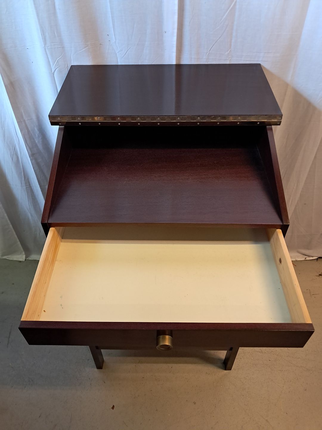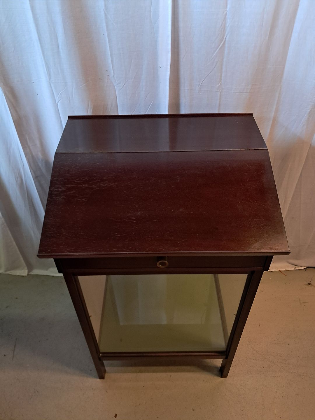 Skrivepult i fineret mahogni og glas, fra 1980erne. Den har brugsspor. Højde 115cm Bredde 70cm Dybde 58cm Emne nummer: 77221