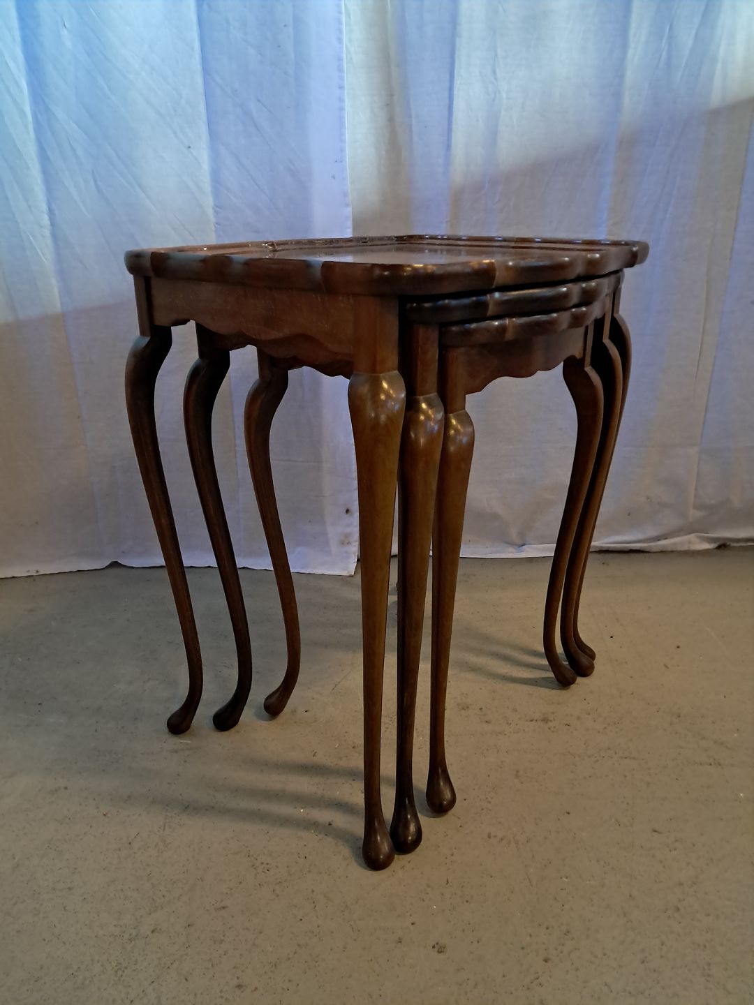 3 Indskudsborde i massivt bøgetræ og fineret nøde og rosentræ, fra 1980erne. De har brugsspor. Højde 56cm Bredde 49cm Dybde 42cm Emne nummer: 77227