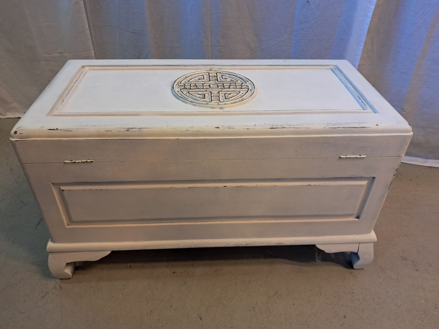 Malet kiste i kamfertræ, fra 1970erne. Den har brugsspor. Højde 41cm Bredde 75cm Dybde 38cm Emne nummer: 77249