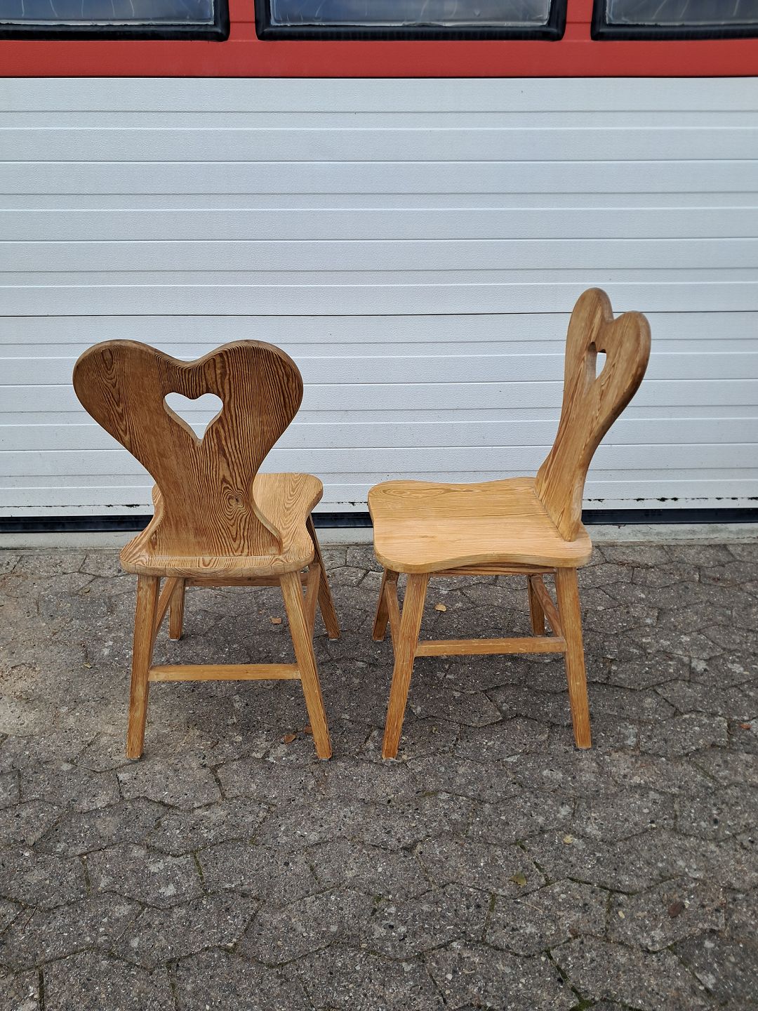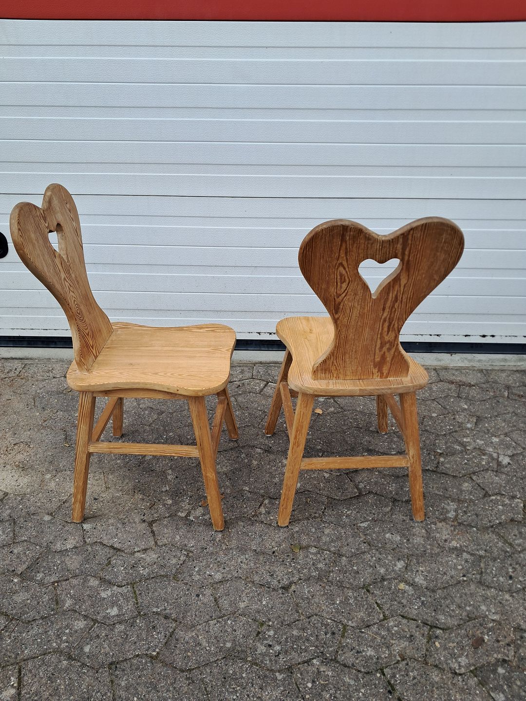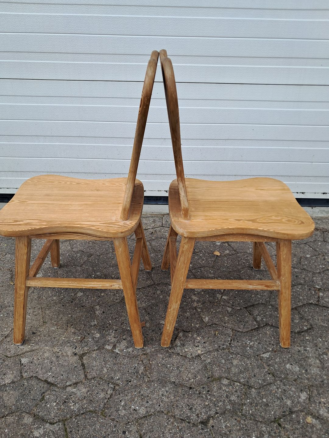 2 Stole i massivt fyrretræ, fra 1980erne. De har brugsspor og er lidt løse i ryggen. Ryghøjde 87cm Sædehøjde 46cm Emne nummer: 77351